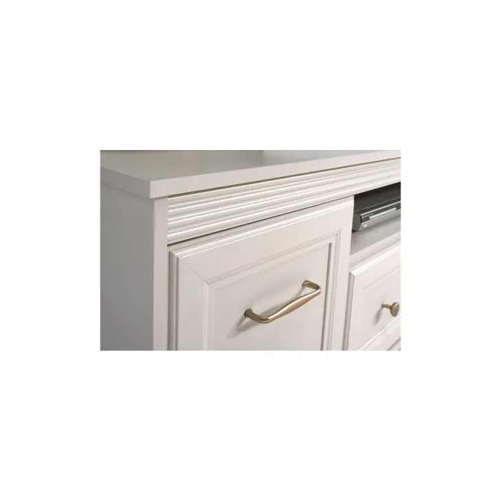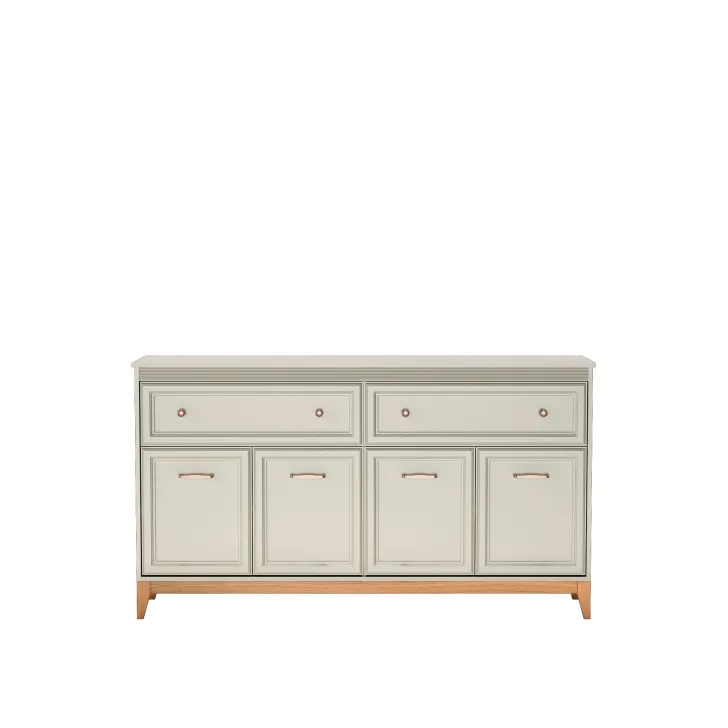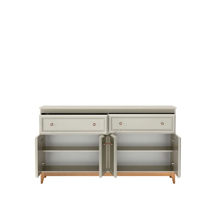 Partia długa komoda DUBAI 2 pozostała zaprojektowana z myślą o harmonii i wyważonej elegancji. Doskonale komponuje się zarówno w klasycznych, jak i nowoczesnych aranżacjach wnętrz. Ciepło naturalnego drewna zestawione z odcieniem kaszmir nadaje jej lekkości, a dekoracyjne listwy MDF na frontach dodają klasycznego uroku. Ponadto, stylowe uchwyty w kolorze miedzi subtelnie podkreślają jej charakter.