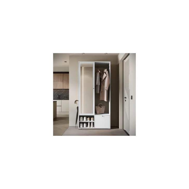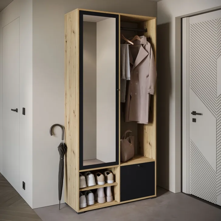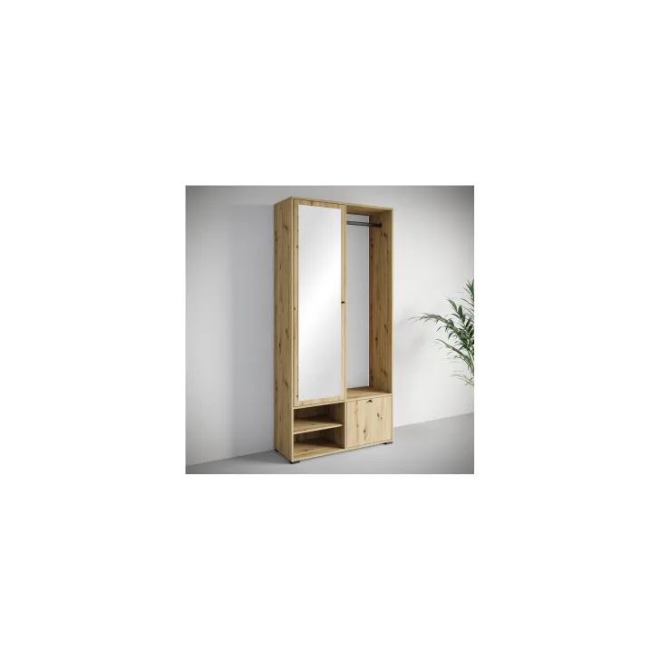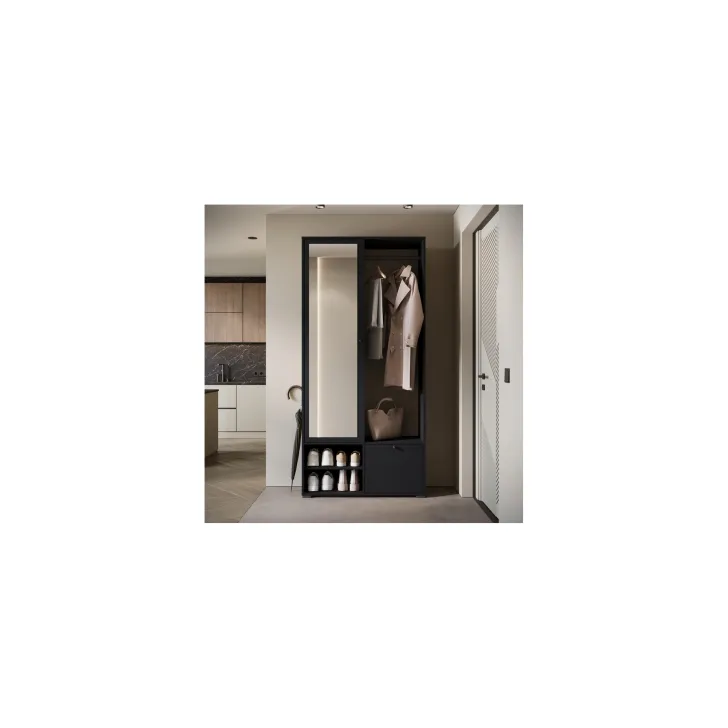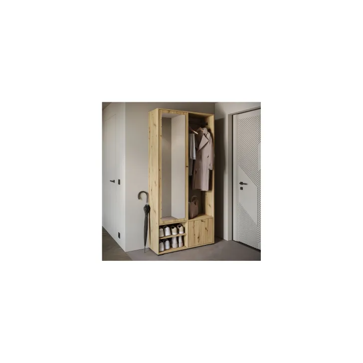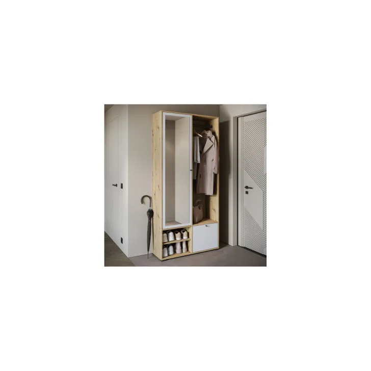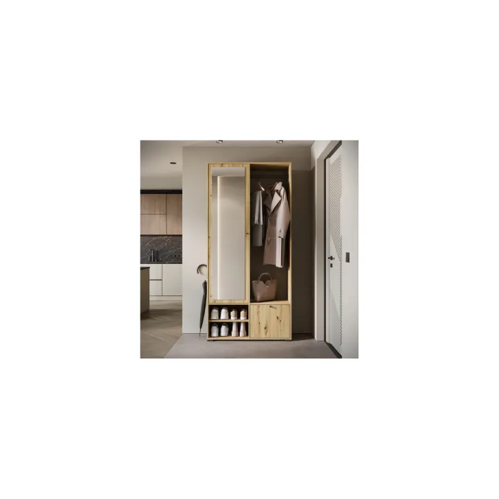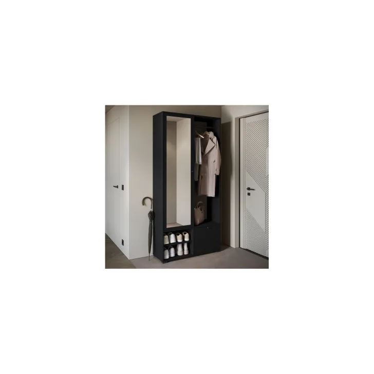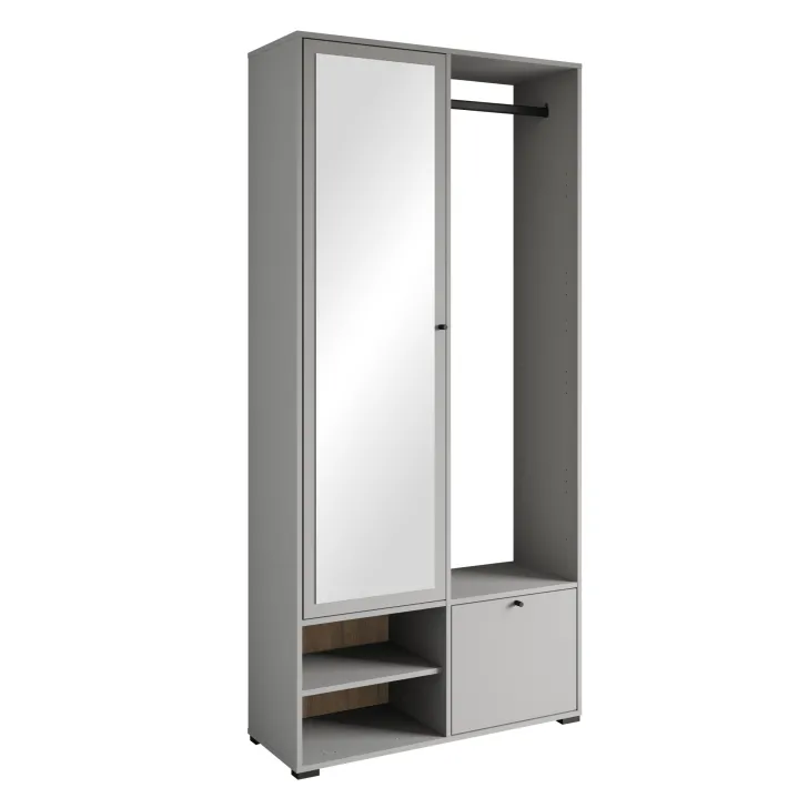 Główną część garderoby stanowi szafa z szerokimi półkami, które pomieszczą ubrania, dodatki lub dokumenty. Szafa ta wyposażona jest również w duże lustro, które optycznie powiększa pomieszczenie i pozwala sprawdzić swój wygląd przed wyjściem z domu. W skład zestawu wchodzą również: solidny metalowy drążek na ubrania, dwie otwarte wnęki oraz praktyczna szafka na buty uruchamiana za pomocą systemu klapy.