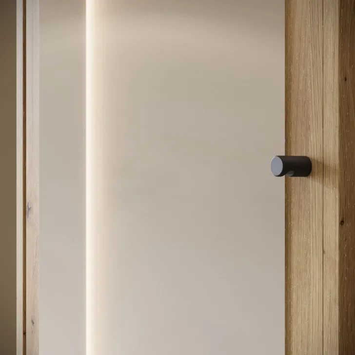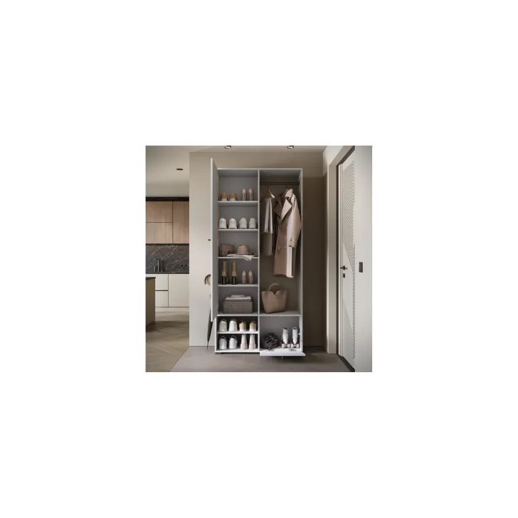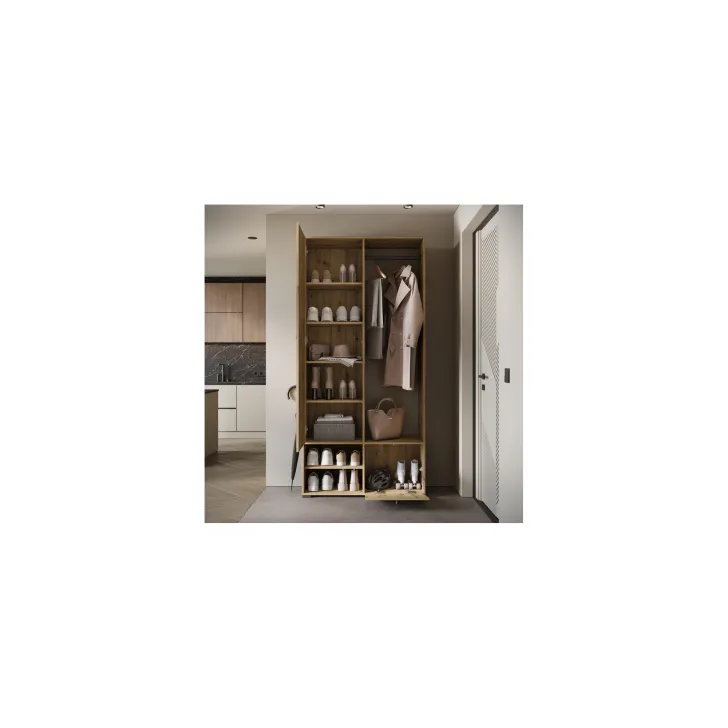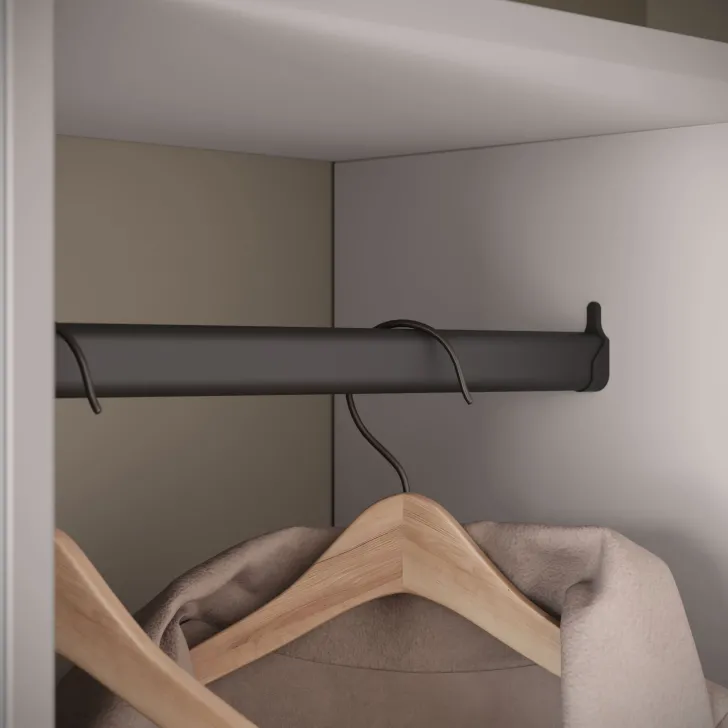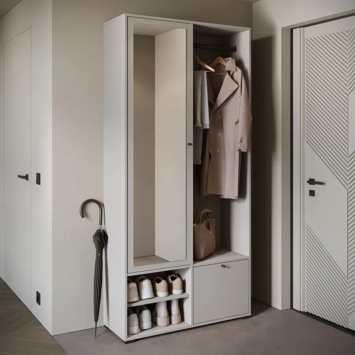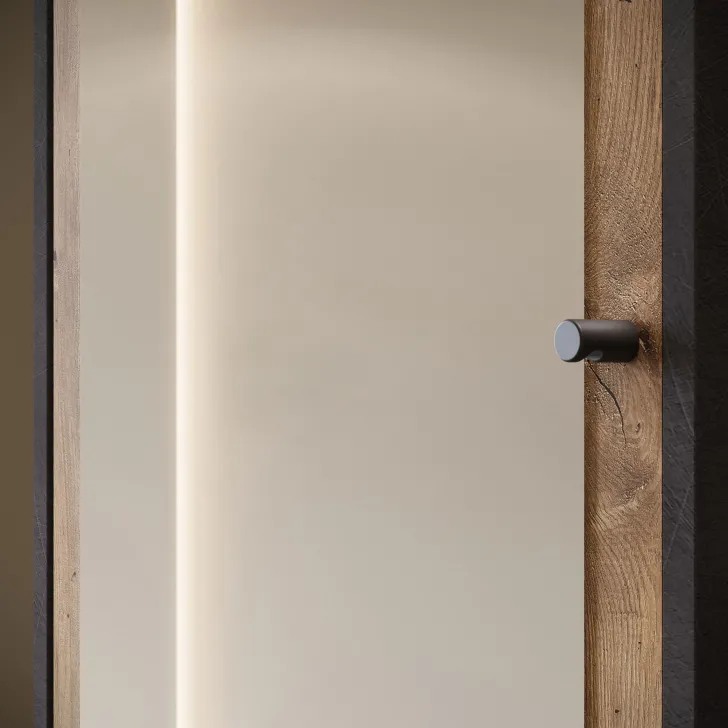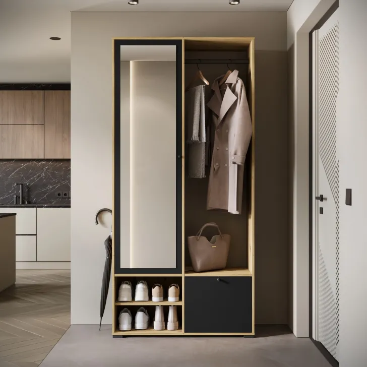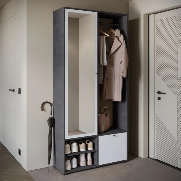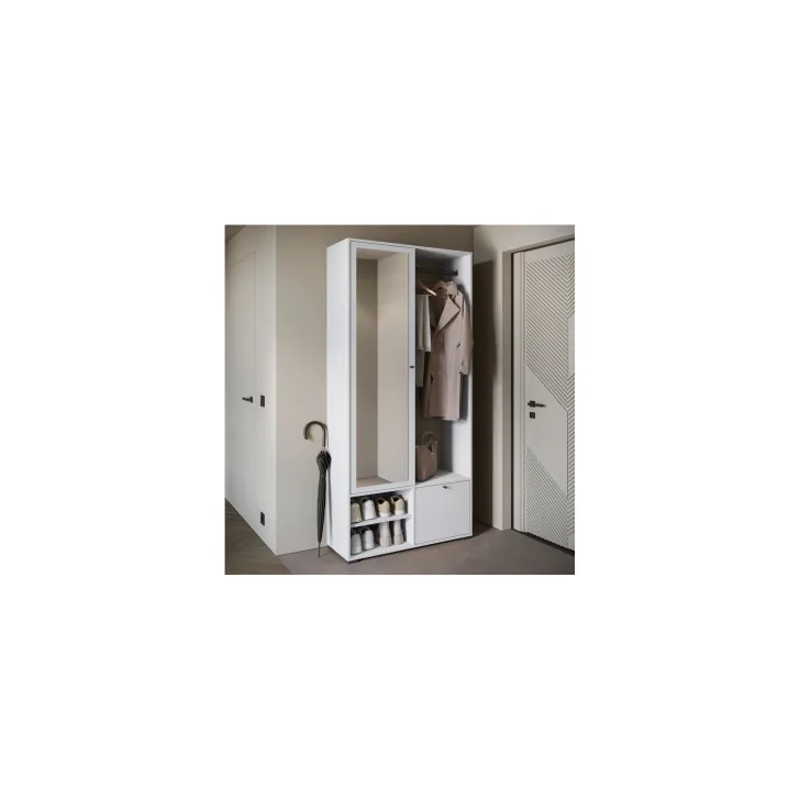 Główną część garderoby stanowi szafa z szerokimi półkami, które pomieszczą ubrania, dodatki lub dokumenty. Szafa ta wyposażona jest również w duże lustro, które optycznie powiększa pomieszczenie i pozwala sprawdzić swój wygląd przed wyjściem z domu. W skład zestawu wchodzą również: solidny metalowy drążek na ubrania, dwie otwarte wnęki oraz praktyczna szafka na buty uruchamiana za pomocą systemu klapy.