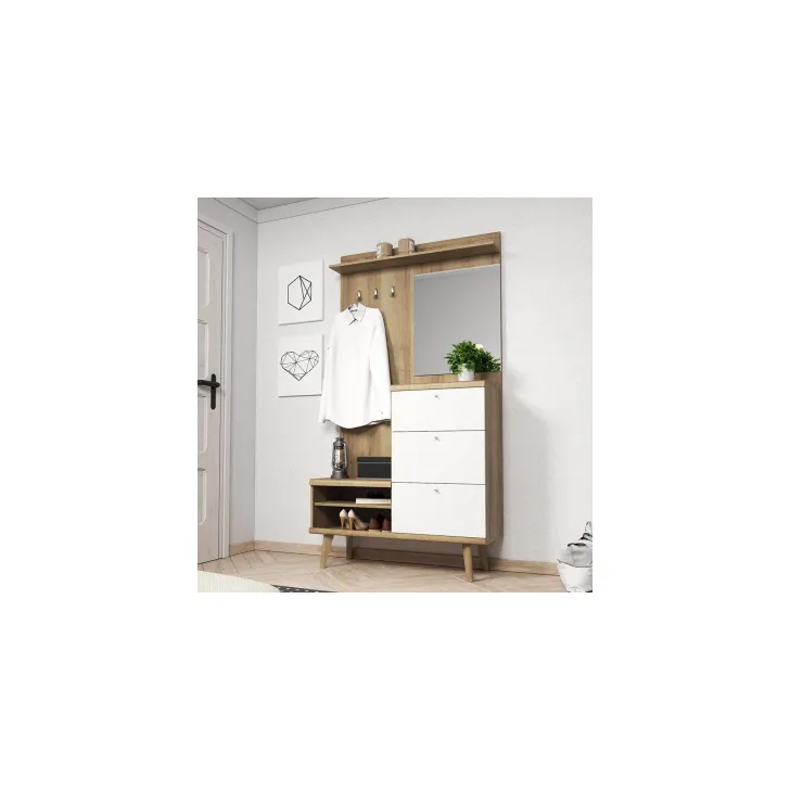 Garderoba "OSLO" z lustrem, dąb Riviera / biały mat Garderoba "OSLO" w kolorach dąb Riviera i biały, w skandynawskiej stylistyce to stylowy, praktyczny i solidnie wykonany mebel. Dzięki niemu zyskasz nie tylko miejsce na buty czy kurtki, lecz także dodatkowe miejsce z lustrem, w które zawsze dobrze spojrzeć przed wyjściem z domu. Garderoba zachwyci Cię funkcjonalnością i pojemnością. Wszystko to dzięki otwartej wnęce przedzielonej półką i szufladom znajdującym się po prawej stronie mebla. Wykonana z laminowanej płyty meblowej, obrzeża z materiału ABS oraz drewniane nóżki zapewniają wysoką jakość wykonania.