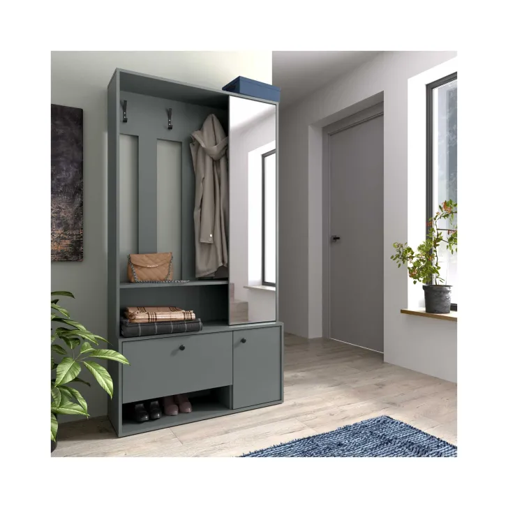 Garderoba "SPOT" z lustrem o szerokości 100 cm to doskonałe rozwiązanie do Twojego przedpokoju. Dostępna w kilku wariantach kolorystycznych, ta garderoba nie tylko będzie praktyczna, ale również idealnie dopasuje się do wystroju wnętrza. W skład zestawu wchodzi szafka z półką za drzwiami, cztery haczyki ukryte za lustrem oraz otwierana szafka na buty i otwarta wnęka dedykowana butom. Pomimo niewielkich rozmiarów, garderoba SPOT jest bardzo pojemna i praktyczna. Wykonana z wysokiej jakości laminowanej płyty meblowej, z tylną ścianą z płyty HDF, garderoba jest trwała i odporna na uszkodzenia. Dodatkowe informacje:
