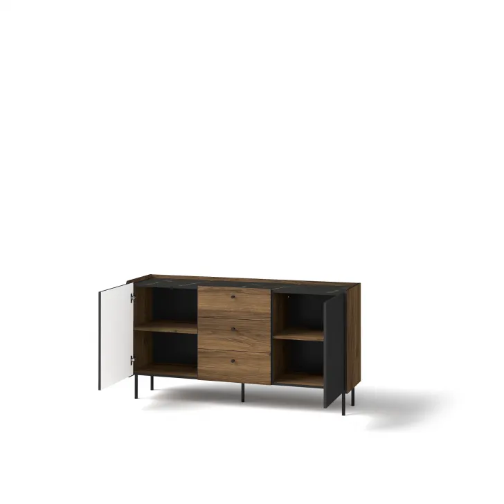 Komoda 150 cm Pereto 5 zdecydowanie ułatwi porządkowanie codziennych przedmiotów. Jej pikantne metalowe nóżki dodają niepowtarzalnego, stylowego akcentu, a dwa praktyczne drzwi oraz trzy szuflady umożliwiają skuteczne uporządkowanie najdroższych Ci rzeczy. Wyróżniające ją kolory – orzech warmia, san sebastian oraz czarny mat, sprawiają, że ten mebel doskonale wkomponuje się w różnorodne stylizacje wnętrz.