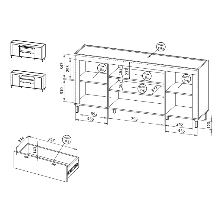 Wymiary Komoda "ASSO 7" z otwartymi półkami i szufladą/kominek LED: