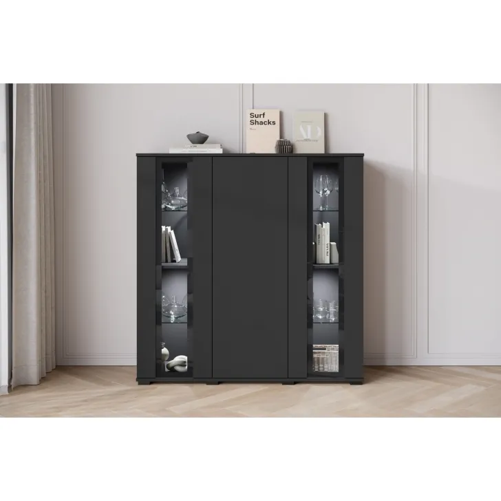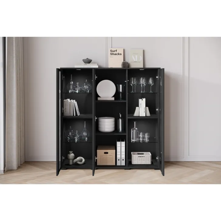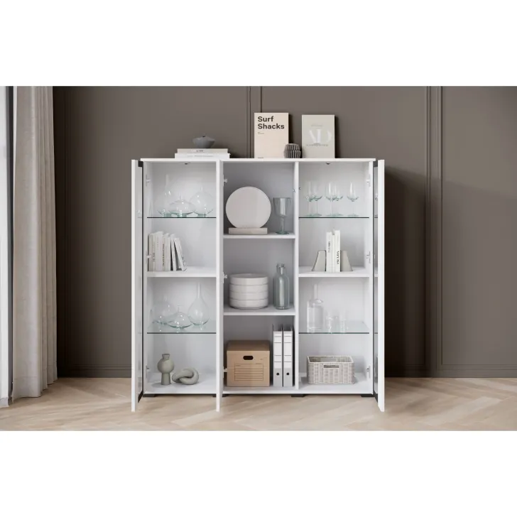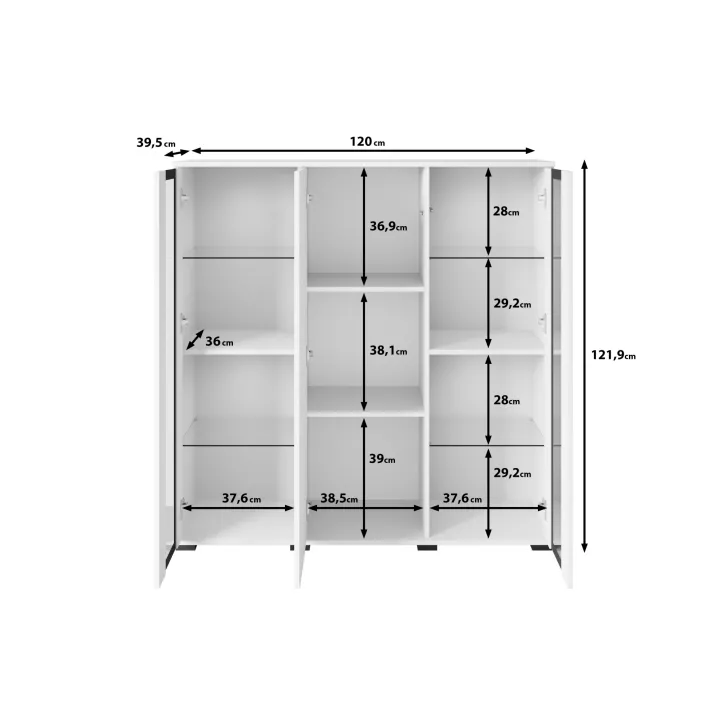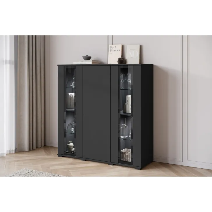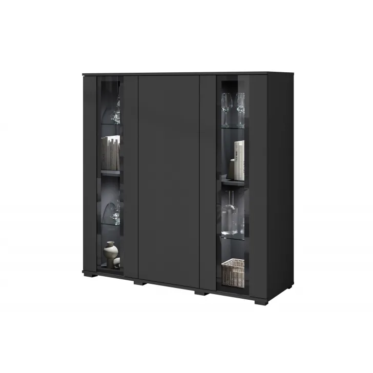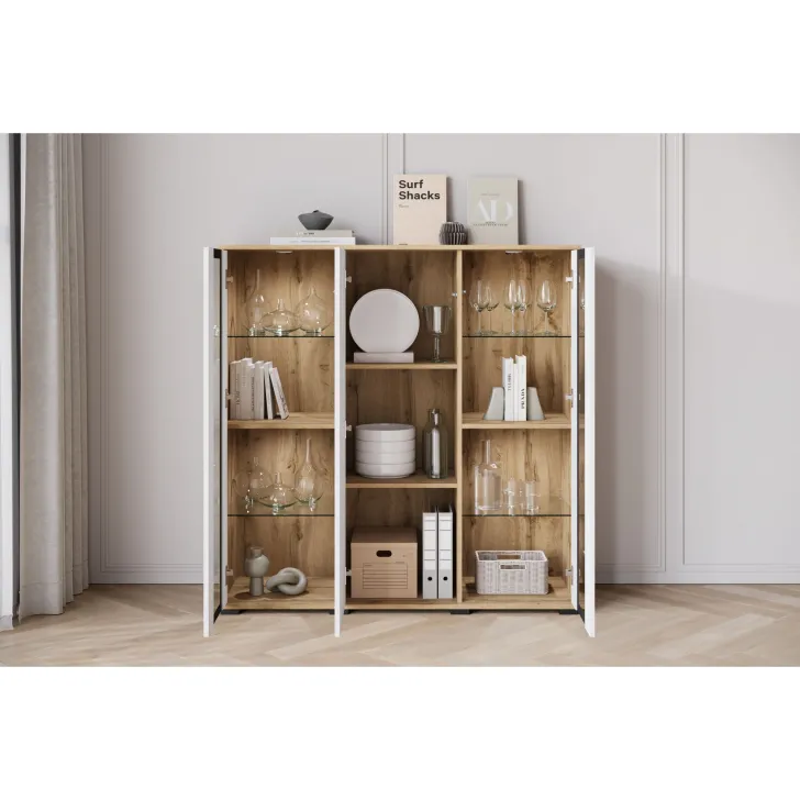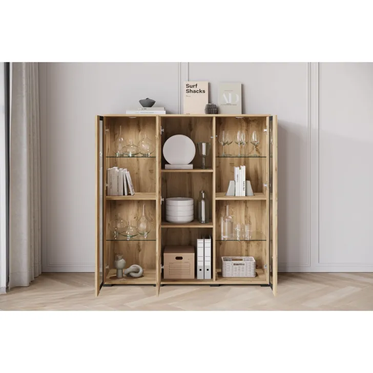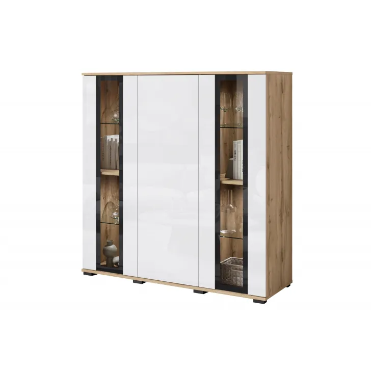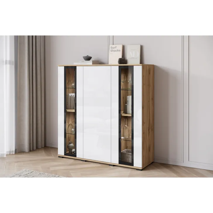 Przywołując zdobycze nowoczesnego designu, Komoda FARO 120 cm staje się niezastąpionym elementem aranżacji salonu, jadalni czy pokoju dziennego. Swoją funkcjonalnością odpowiada na potrzeby estetycznego przechowywania oraz eksponowania przedmiotów. Perspektywiczne połączenie zamkniętych szafek z przeszklonymi segmentami tworzy mebel wyjątkowo stylowy i praktyczny jednocześnie. Uniwersalny wygląd komody umożliwia jej swobodne wpasowanie się w różne konwencje wnętrz, harmonizując z zarówno klasycznymi, jak i nowoczesnymi przestrzeniami. Istnieje opcja dokupienia subtelnie podkreślającego zawartość witryn oświetlenia LED, wprowadzającego przenikliwy, miły nastrój do pomieszczenia. Podstawową wartością komody FARO 120 cm jest solidność jej wykonania. Budowa mebla obejmuje korpus i fronty wykonane z płyty laminowanej o grubości 15 mm, co przekłada się na trwałość użytkowania. Lewy i prawy front są sklejane ze szkła, a krawędzie oraz fronty oklejane są obrzeżem ABS o grubości 0,5mm. Ponadto, komoda oferuje cztery półki szklane oraz luźne półki z regulacją +/- 32mm.