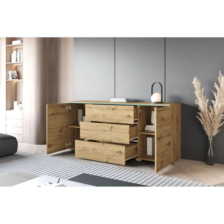 - Wysokiej jakości płytę laminowaną o grubości 15mm, z której wykonane są wszystkie korpusy oraz fronty komody, zapewniając jej wytrzymałość i długowieczność.