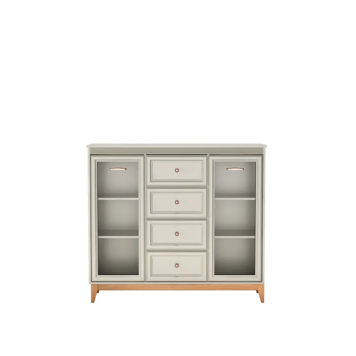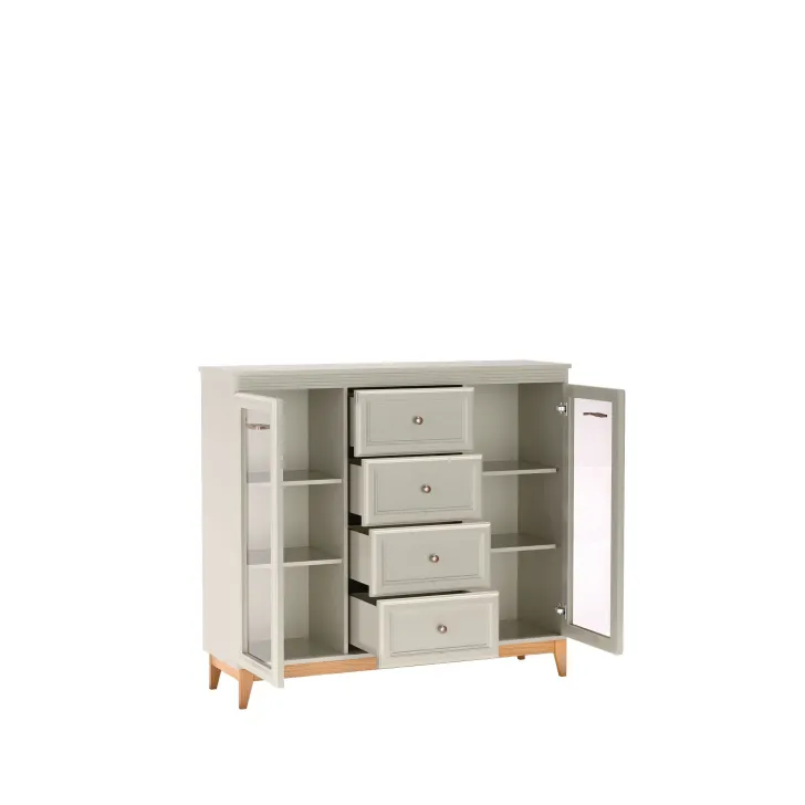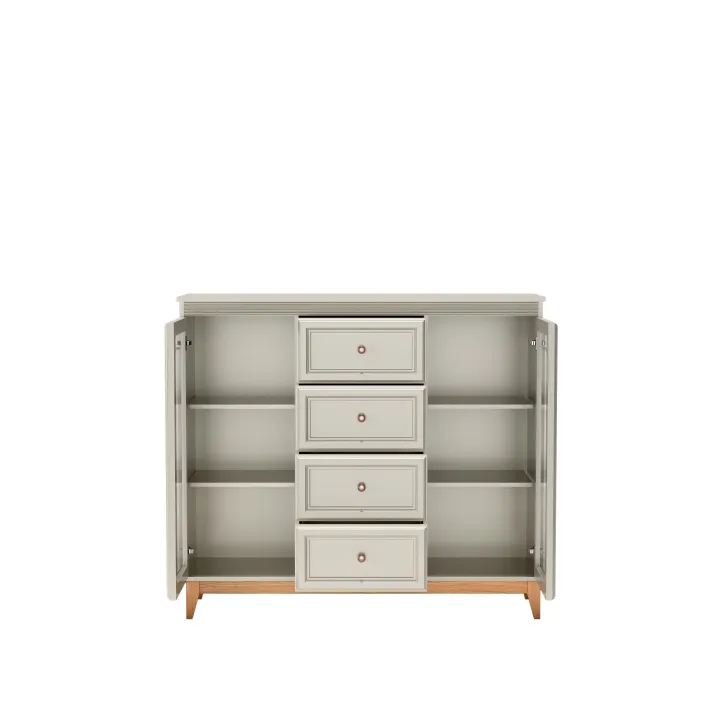 Podkreślamy, że wnętrze komody jest starannie przemyślane. Dzięki przeszklonym frontom po obu stronach mebla, możemy elegancko uwypuklić ulubione książki, zastawę czy dodatki dekoracyjne. Praktyczne szuflady, umieszczone w środkowej części komody, umożliwiają łatwy dostęp do schowanych ubrań, dokumentów, lub drobnych akcesoriów.