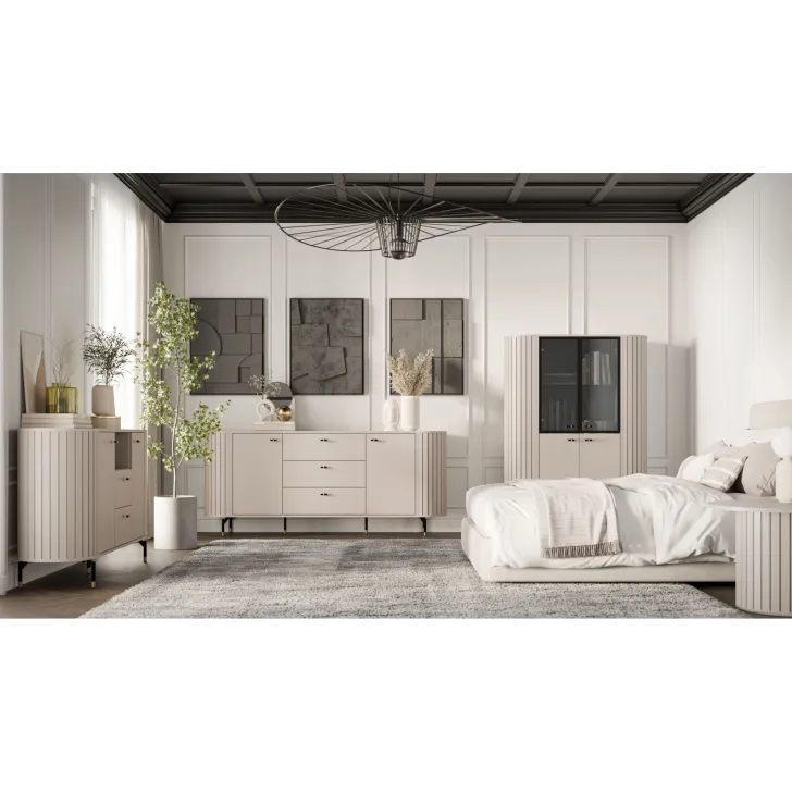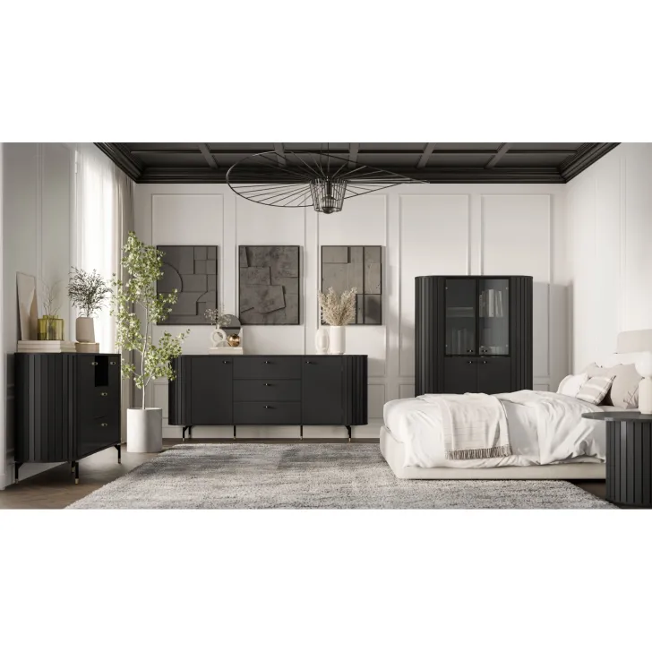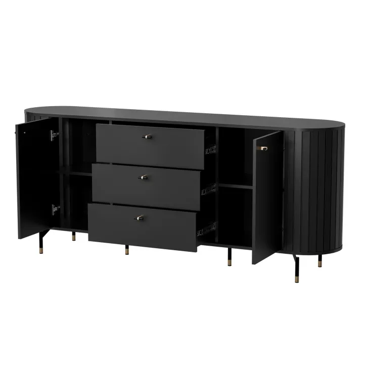 Delikatne nóżki i uchwyty w kolorze czarno-złotym dodają meblom lekkości i podkreślają nowoczesny charakter. Nie tylko wygląda niesamowicie, ale dysponuje również praktycznymi funkcjami. Wyposażona jest w trzy pojemne szuflady oraz dwoje drzwi, za którymi znajdują się przegródki przedzielone półkami. Zapewnia to doskonałe rozwiązanie do przechowywania, utrzymując porządek i łatwy dostęp do wszystkich Twoich drobiazgów.