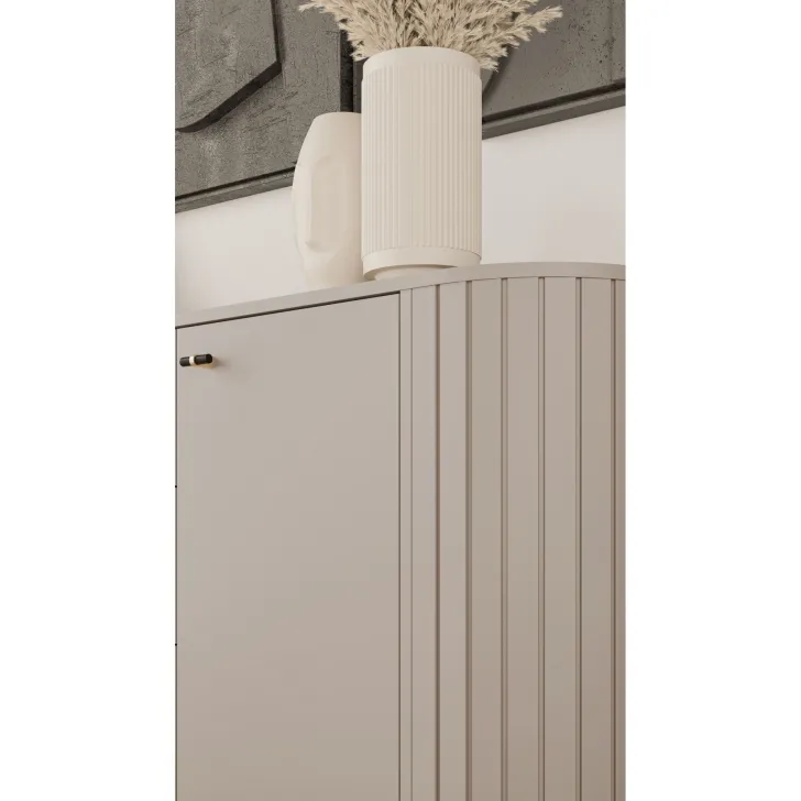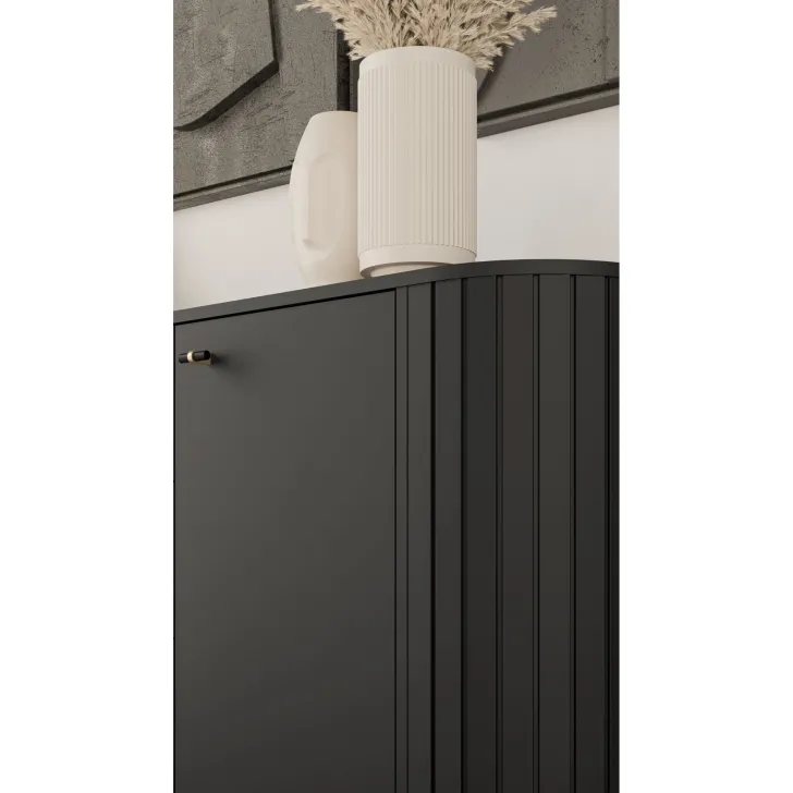 Jej wyjątkowa konstrukcja charakteryzuje się zaokrąglonymi bokami wykonanymi z MDF oraz solidnym korpusem i tyłem wykonanym z płyty laminowanej o grubości 16 mm. To pozwala na jej dowolne ustawienie, nawet w centralnej części pokoju.