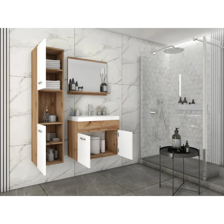 Odkryj piękno nowoczesnej elegancji z Kompletem mebli łazienkowych "MONAL", perfekcyjnie odzwierciedlającym połączenie funkcjonalności i stylu. Wykorzystany w produkcji kolor dąb Wotan odsłania swoją niepowtarzalną, naturalną fakturę i ciepłe tony, które idealnie kontrastują z białym połyskiem, nadając przestrzeni lekkości i rześkości. Tym samym, komplet z łatwością wpisuje się zarówno w tradycyjne jak i nowoczesne łazienki, stanowiąc pomocnik w organizacji przestrzeni o wysokim stopniu estetyki. Zaprojektowany z myślą o praktyczności, komplet "MONAL" składa się z mebli wykonanych z płyty laminowanej o grubości 15 mm, co zapewnia ich trwałość i odporność na wilgoć. Metalowe uchwyty zwiększają funkcjonalność, a krawędzie pokryte obrzeżem ABS długowieczność.