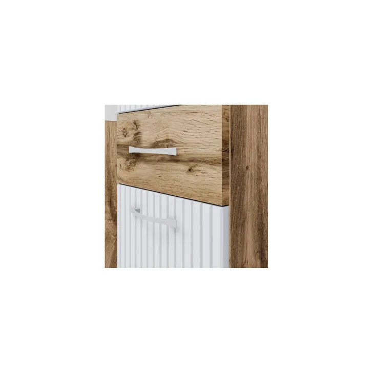 Fronty mebli zostały wykonane z płyty MDF w kolorze białym z 3D wzorem ryfli, natomiast wieńce górne i korpusy z laminowanej płyty o grubości 15 mm w eleganckim odcieniu dębu wotan. Dodatkowo, metalowe uchwyty oraz krawędzie pokryte obrzeżem ABS nadają meblom nowoczesny i stylowy wygląd.