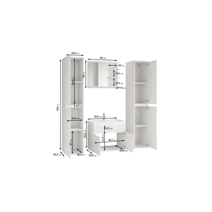 - Szafka z umywalką: Wys. 52,2 cm, Szer. 59,9 cm, Gł. 34,5 cm