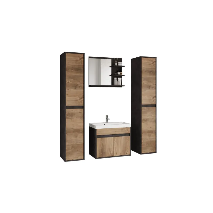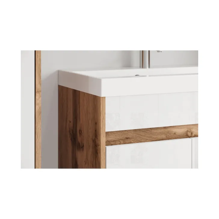 Do zestawu dołączone jest eleganckie, praktyczne lustro oraz biała umywalka wykonana z konglomeratu, która jest niezwykle trwała i łatwa do utrzymania w czystości.