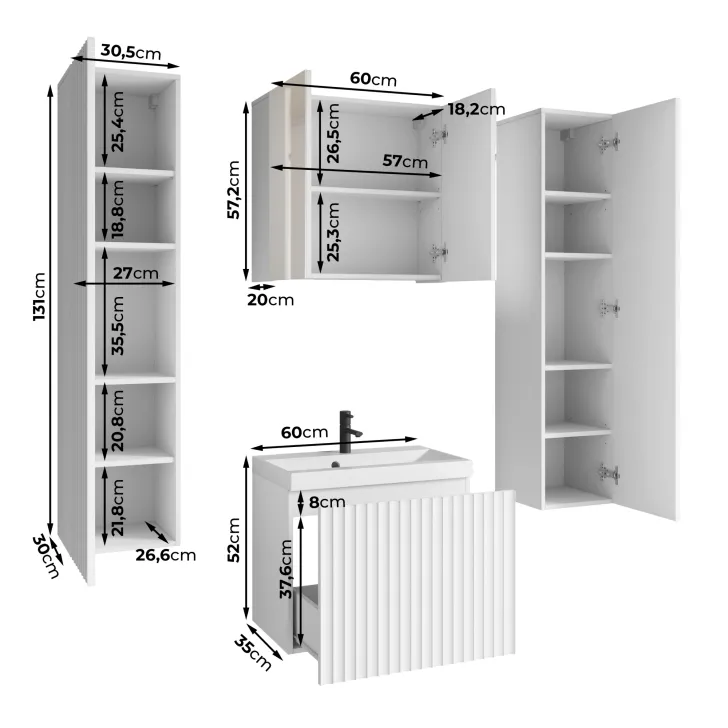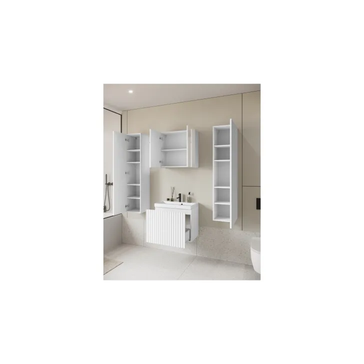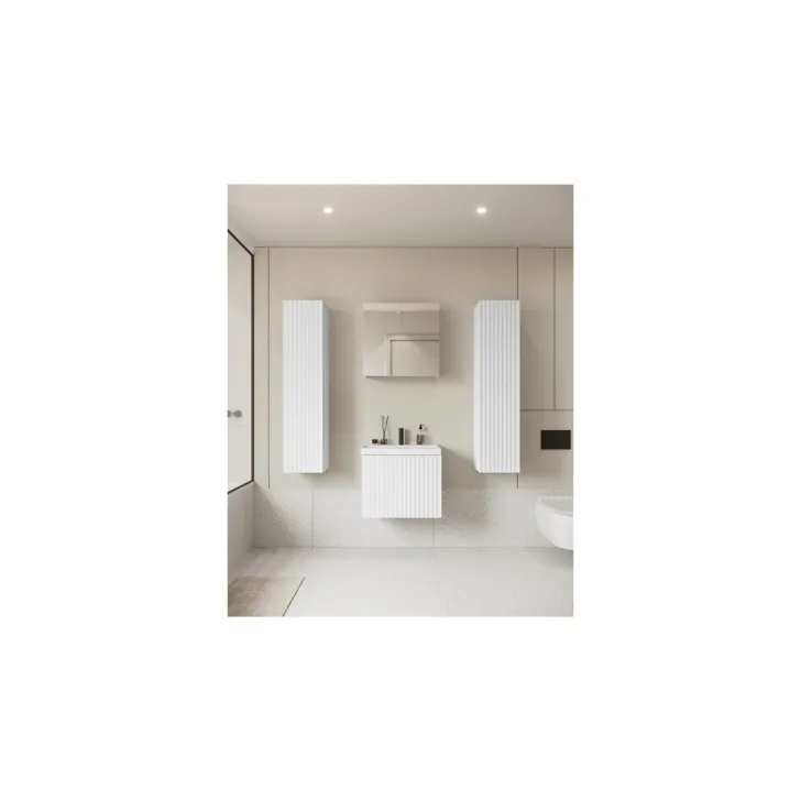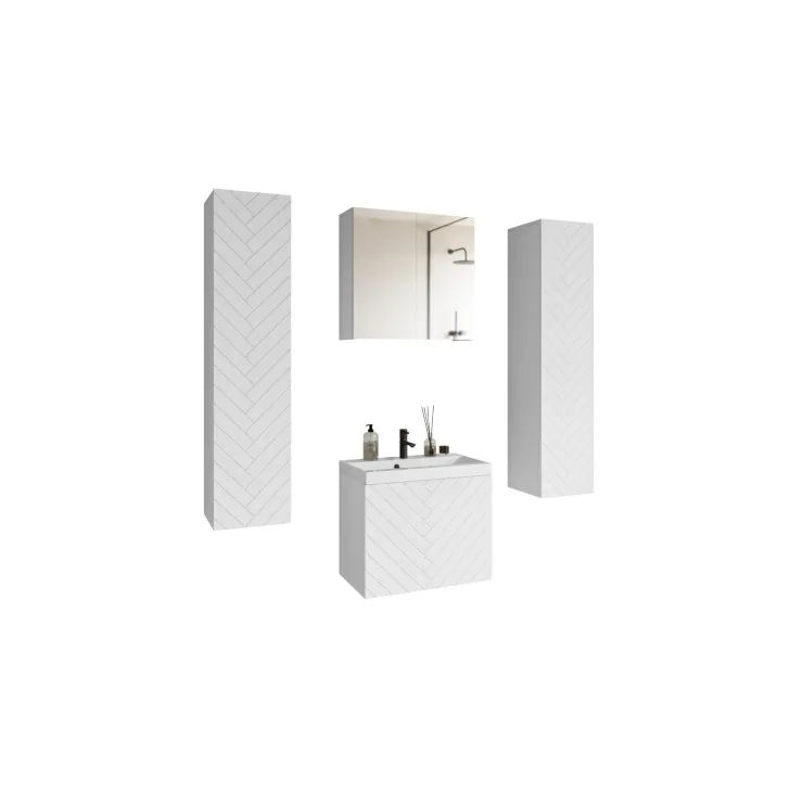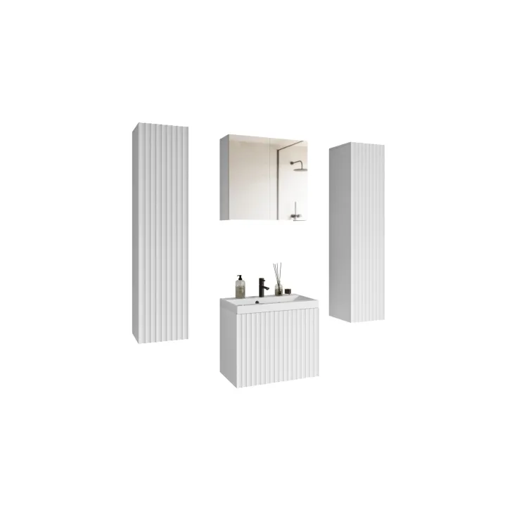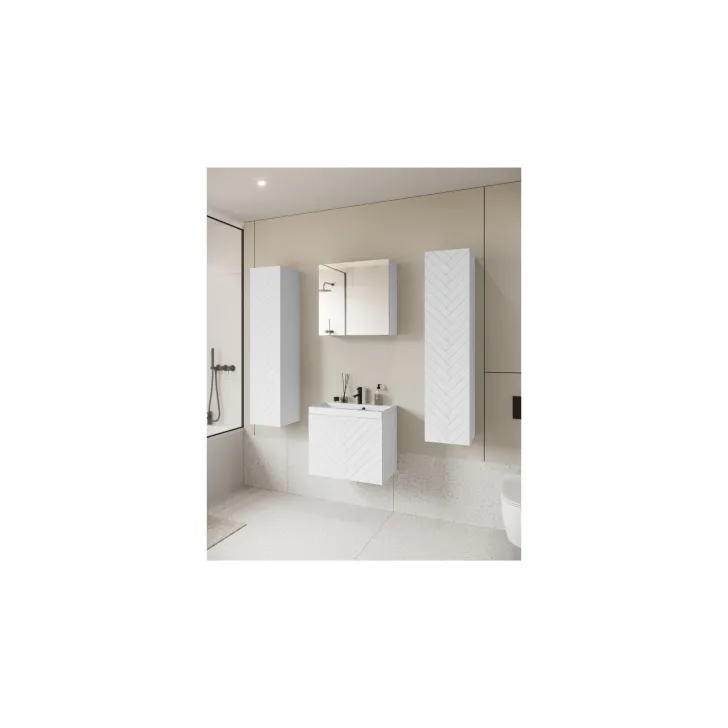 Wysoką jakość produktu podkreślają fronty wykonane z ryflowanej płyty MDF, dostępne w trzech kolorach i dwóch unikalnych wzorach 3D: 'jodełka' i 'pionowe ryflowanie'. Zintegrowana z zestawem, elegancka umywalka z konglomeratu, doda funkcjonalnej przestrzeni każdej łazience.