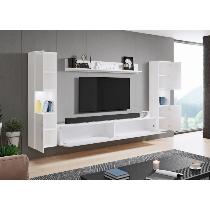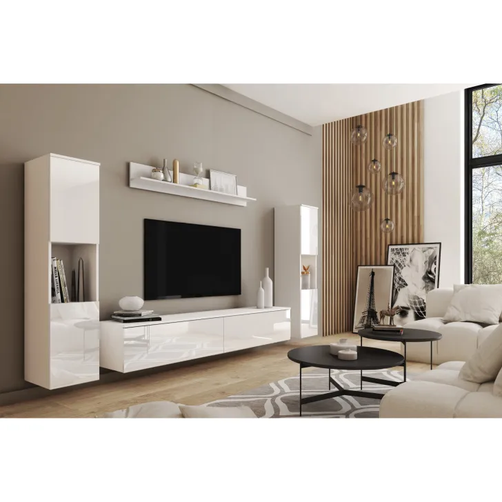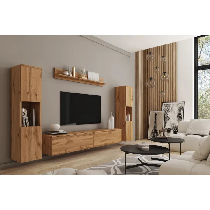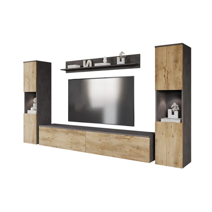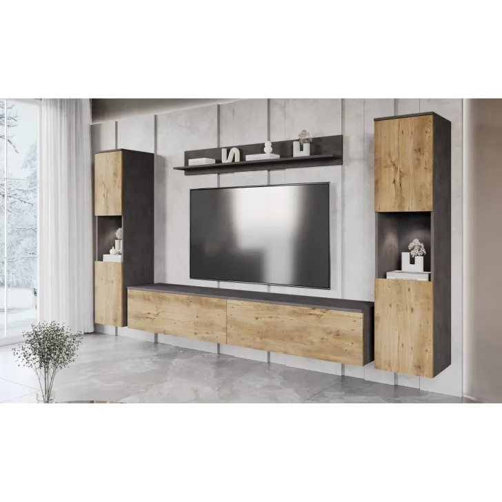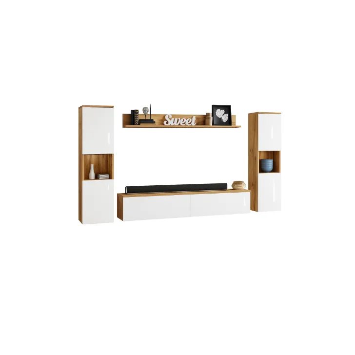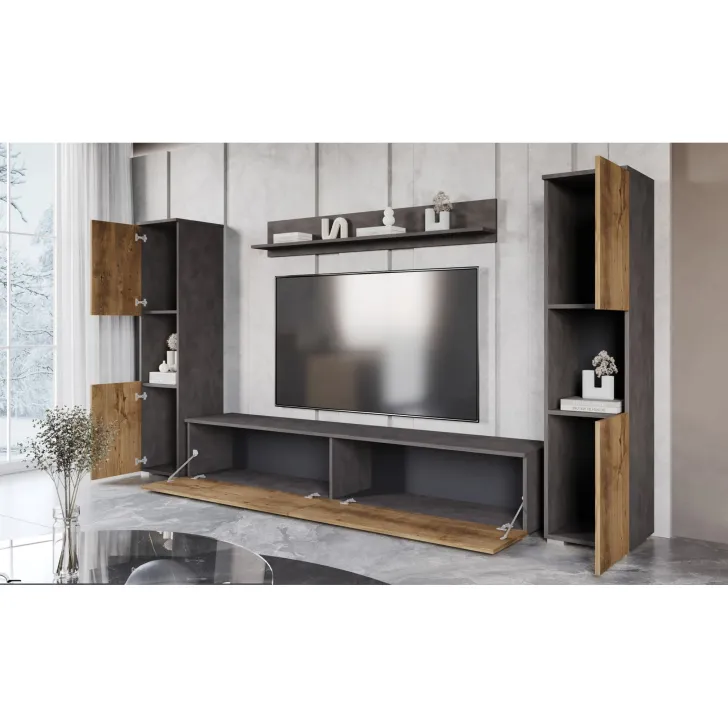 Zestaw składa się z czterech funkcjonalnych części, które oferują wygodę użytkowania i doskonale dopasują się do wnętrza, zarówno mniejszych, jak i większych. Do dyspozycji mamy otwarte wnęki, idealne do wyeksponowania ulubionych ozdób, ale również szafki z pojemnymi wnętrzami, które zapewnią komfort segregacji różnego rodzaju przedmiotów. Wśród nich znajdziemy również szafkę RTV, która kryje w sobie dwa schowki ukryte za pełnymi frontami drzwi, otwieranych z góry do dołu w systemie klap.
