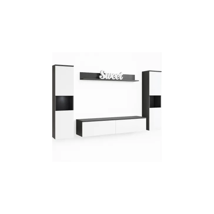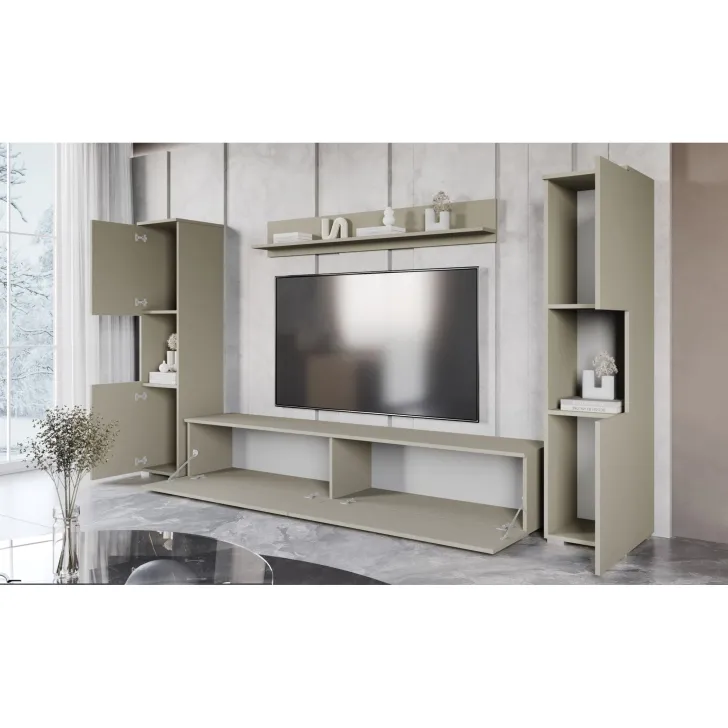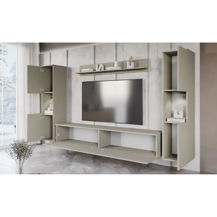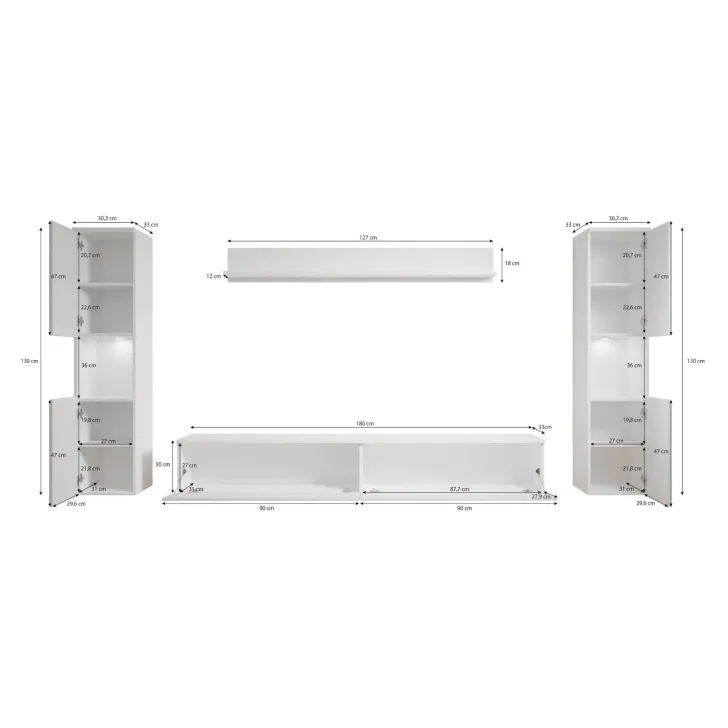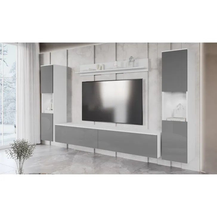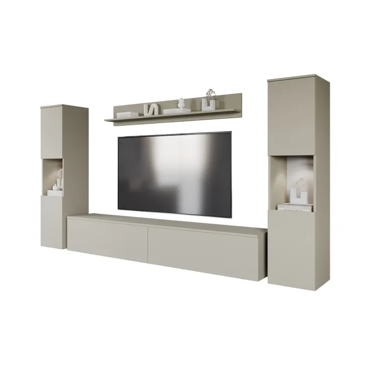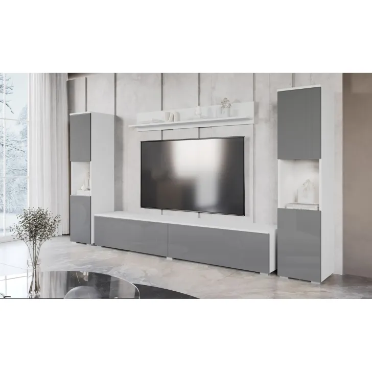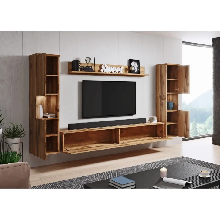 Zestaw składa się z czterech funkcjonalnych części, które oferują wygodę użytkowania i doskonale dopasują się do wnętrza, zarówno mniejszych, jak i większych. Do dyspozycji mamy otwarte wnęki, idealne do wyeksponowania ulubionych ozdób, ale również szafki z pojemnymi wnętrzami, które zapewnią komfort segregacji różnego rodzaju przedmiotów. Wśród nich znajdziemy również szafkę RTV, która kryje w sobie dwa schowki ukryte za pełnymi frontami drzwi, otwieranych z góry do dołu w systemie klap.