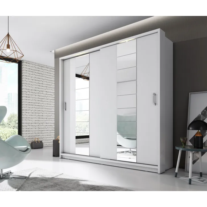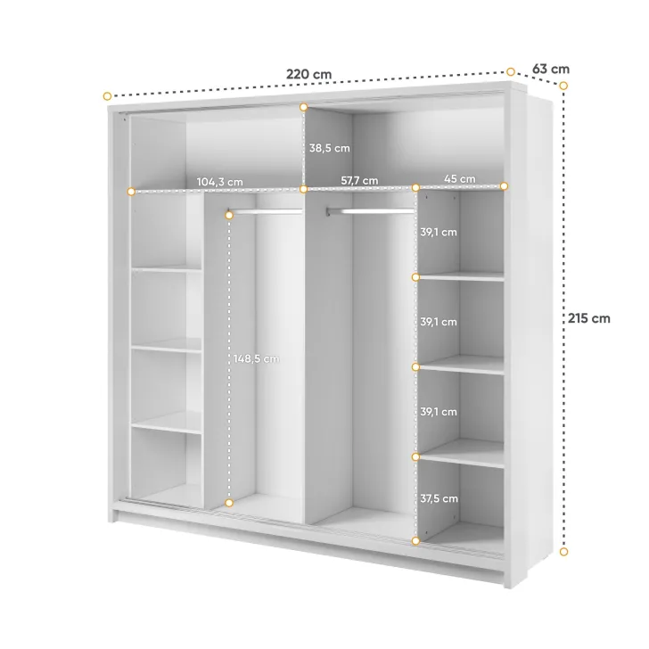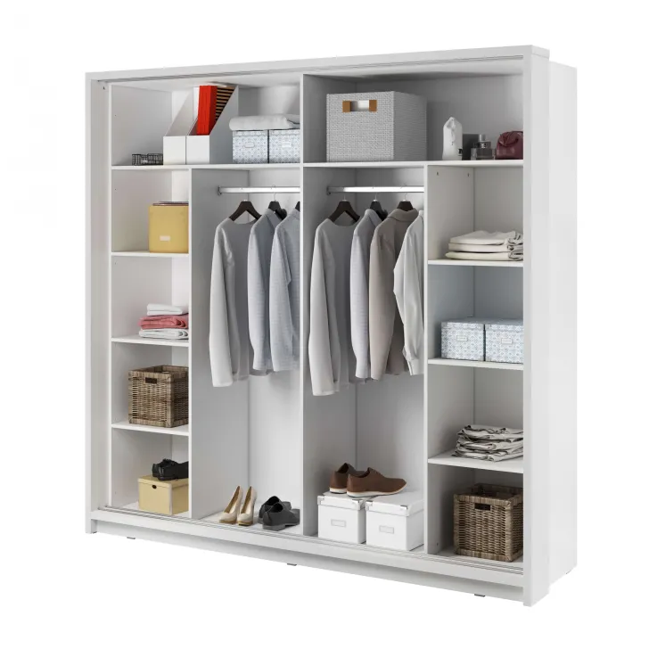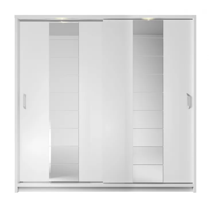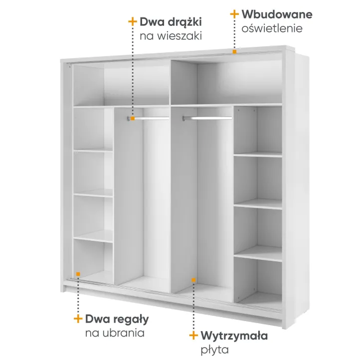 Lampki LED zamontowane wewnątrz szafy, podkreślają jej nowoczesny design, jednocześnie ułatwiając organizację przechowywanych w niej rzeczy. Do produkcji szafy użyto płyty laminowanej o grubości 16mm, co gwarantuje jej trwałość i długowieczność, a białe wykończenie wprowadza do pomieszczenia świeżość i poczucie przestronności.