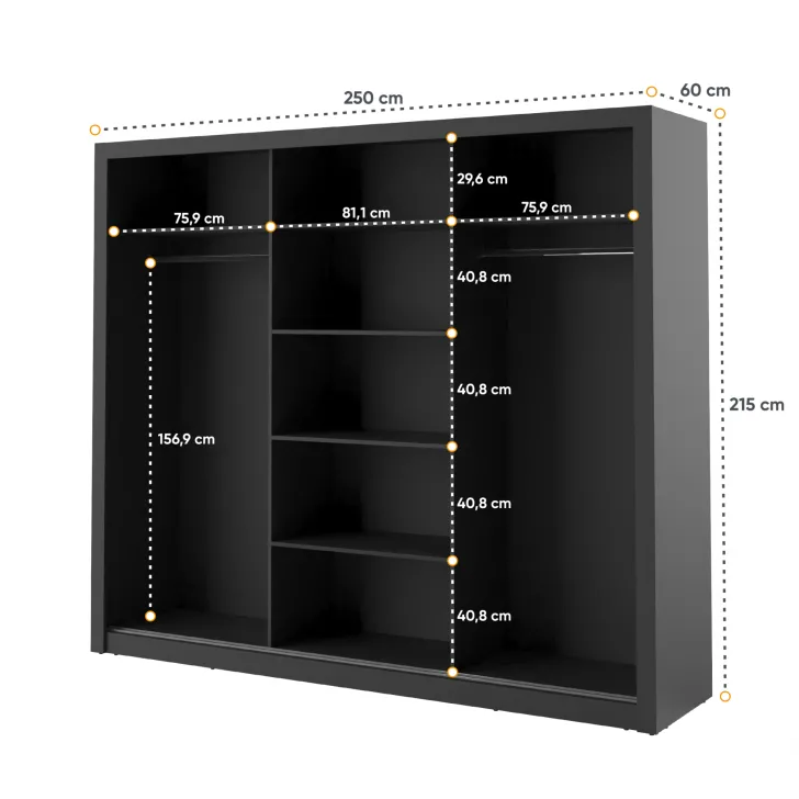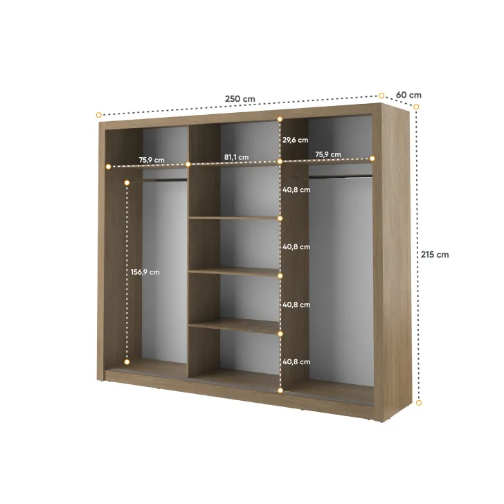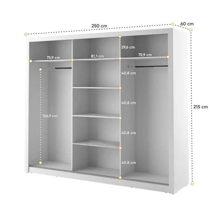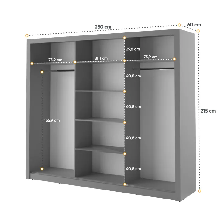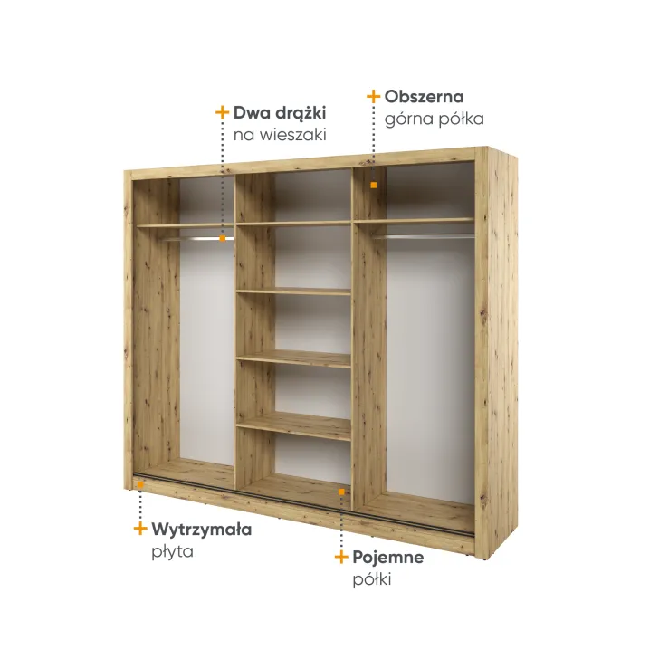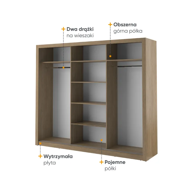 Wewnątrz szafy znajdują się dwa wygodne drążki na ubrania oraz kilka pojemnych półek. Dzięki temu każdy element garderoby znajdzie tutaj swoje miejsce. Dodatkowym atutem są otwory montażowe na tylnej i bocznych ściankach szafy, które umożliwiają bezpieczne przymocowanie mebla do ściany. Takie rozwiązanie zwiększa stabilność szafy, a także minimalizuje ryzyko jej przewrócenia.
