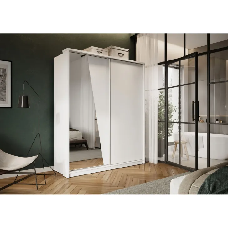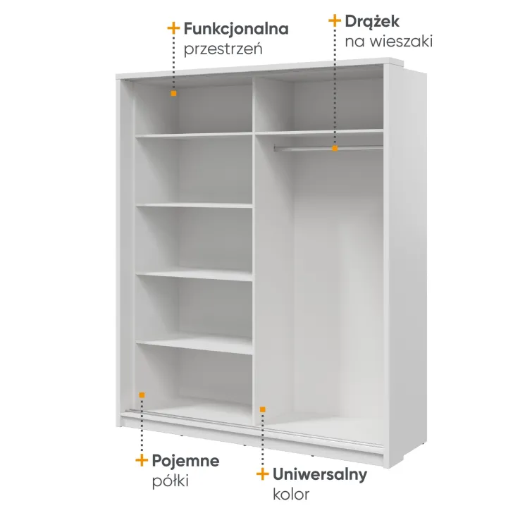 Dwoje przesuwnych drzwi ułatwiają dostęp do wnętrza szafy, pozwalając na optymalne wykorzystanie przestrzeni. Wyróżnia ją ciekawe urozmaicenie - lustro umieszczone na jednym z frontów drzwi. Optycznie powiększa ono przestrzeń, a jednocześnie ułatwia codzienne stylizacje, oszczędzając czas przed wyjściem z domu.