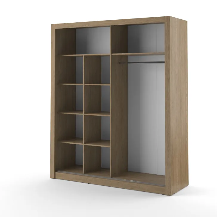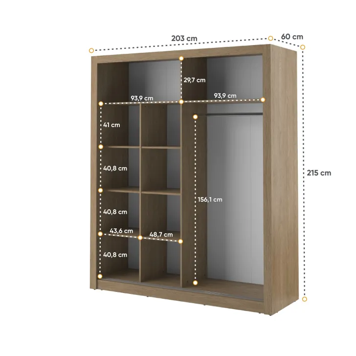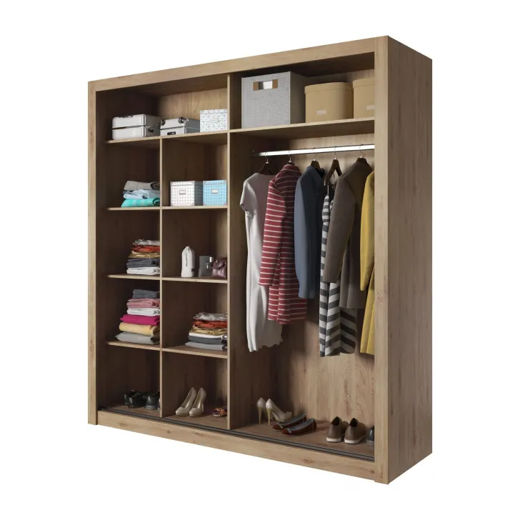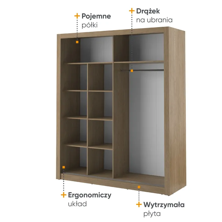 Na uwagę zasługują dwoje drzwi przesuwnych, które sprawiają, że szafa zajmuje mniej przestrzeni i jest łatwa w użyciu. Wewnątrz znajdziecie długi drążek na ubrania, dwa wewnętrzne regały z półkami oraz pojemne górne półki. Te ostatnie doskonale sprawdzą się do przechowywania rzeczy sezonowych, obuwia lub nawet walizek.