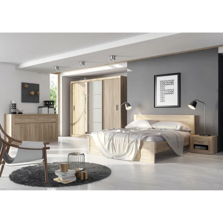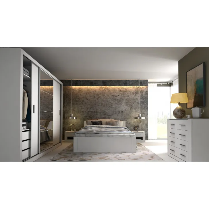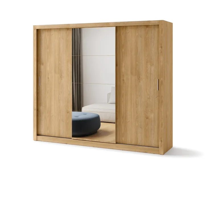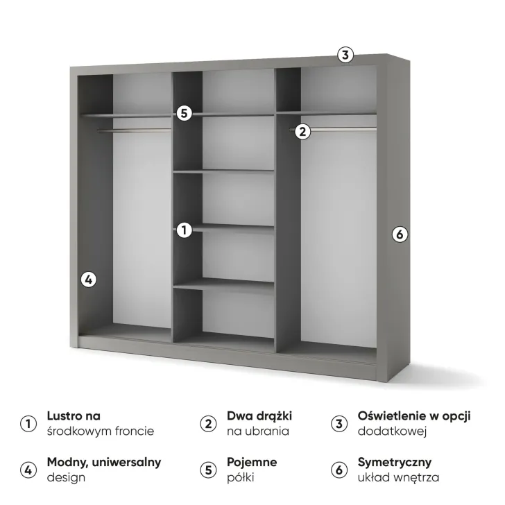 Szafa JADIA 1 to funkcjonalna odpowiedź na Twoje potrzeby organizacji przestrzeni. Niezastąpiony element każdego domu, stworzony z myślą o oszczędzaniu miejsca i systematycznym przechowywaniu ubrań oraz innych akcesoriów. Ta solidna, przestrzenna szafa z kolekcji JADIA, została zaprojektowana z troską o każdy, nawet najmniejszy detal. Wyposażona w trzy praktyczne drzwi przesuwne oraz wewnętrzne lustra, które dodatkowo optycznie powiększają przestrzeń. Co więcej, Szafa JADIA 1 posiada dwie praktyczne szyny na wieszaki i sześć obszernych półek, które pomieszczą wszystko, czego potrzebujesz, umożliwiając zachowanie perfekcyjnego porządku. Poniżej prezentujemy kilka ważnych cech, które wyróżniają ten model:
