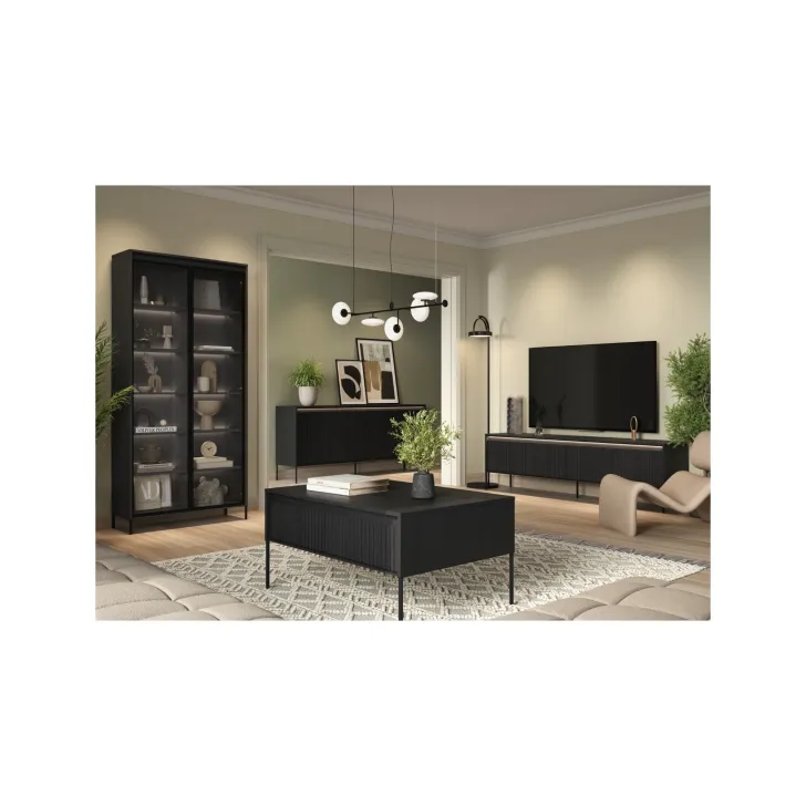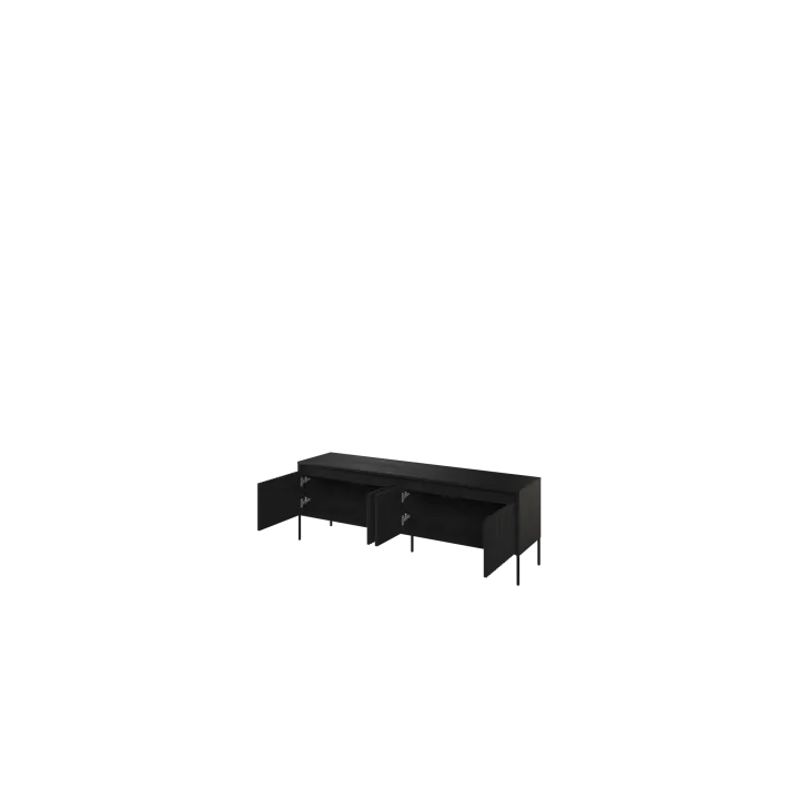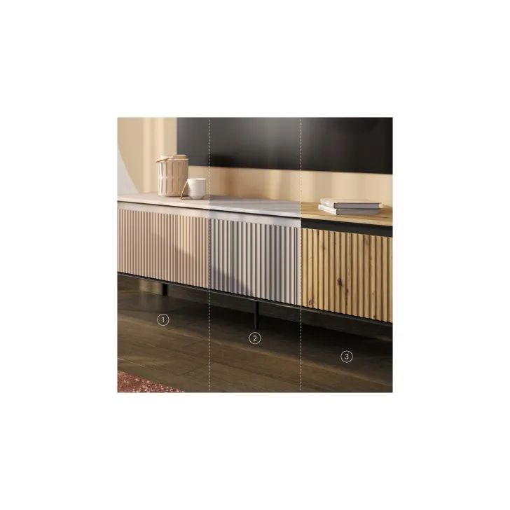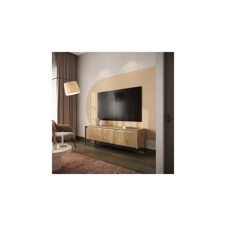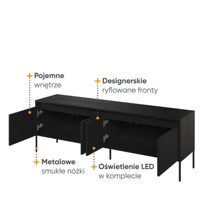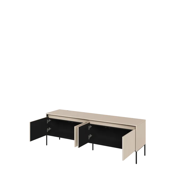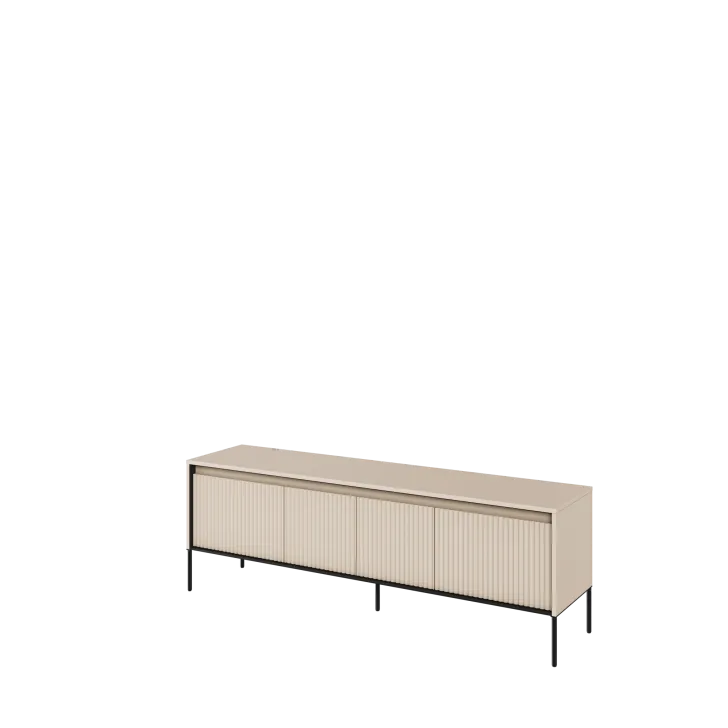 Podkreśl swoje nowoczesne wnętrze z dużą dawką stylu dzięki szafce RTV "TREVIOLO". To wyjątkowy mebel, który przyciągnie spojrzenia i dopełni każde wnętrze - salon, sypialnię czy gabinet. Zaprojektowana z myślą o tych, którzy cenią sobie funkcjonalność połączoną z oryginalnym designem, ta szafka RTV z ryflowanymi frontami MDF charakteryzuje się niebywałą elegancją. Solidna konstrukcja wykonana z wysokiej jakości płyty laminowanej gwarantuje trwałość, a pięć dostępnych kolorów - od bieli, przez szary i piaskowy beż, aż do nasyconego czerni i naturalnego dębu Artisan - pozwoli dostosować szafkę do dowolnej aranżacji wnętrz. Fronty MDF z efektownym ryflowaniem dodają meblowi charakteru, a szeroki blat służy nie tylko jako miejsce na telewizor. Można na nim wyeksponować ulubione dekoracje, czyniąc z szafki RTV centralny punkt pomieszczenia. Szafka RTV "TREVIOLO" zapewnia także znakomitą funkcjonalność. Za czterema drzwiami z systemem push-open kryją się pojemne wnęki, dzięki którym z łatwością zorganizujesz przestrzeń do przechowywania. Do atutów mebla zaliczają się też metalowe nóżki nadające mu lekkości oraz wytrzymała ściana tylna z płyty HDF.