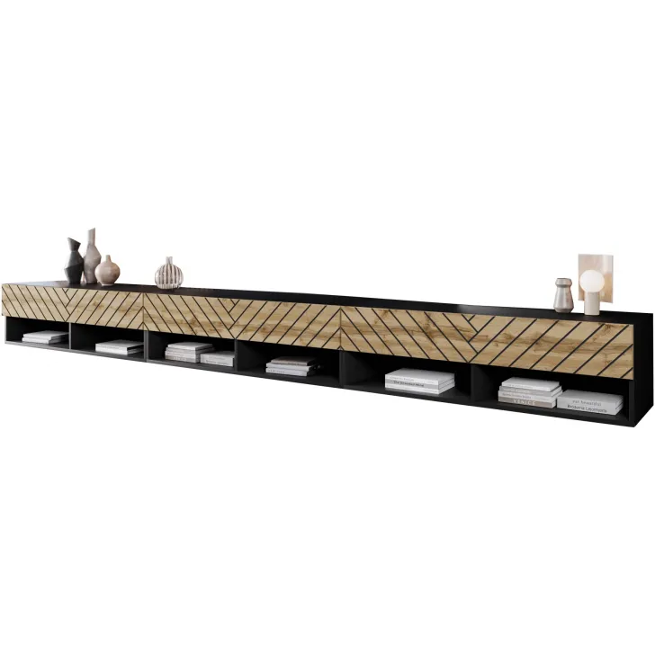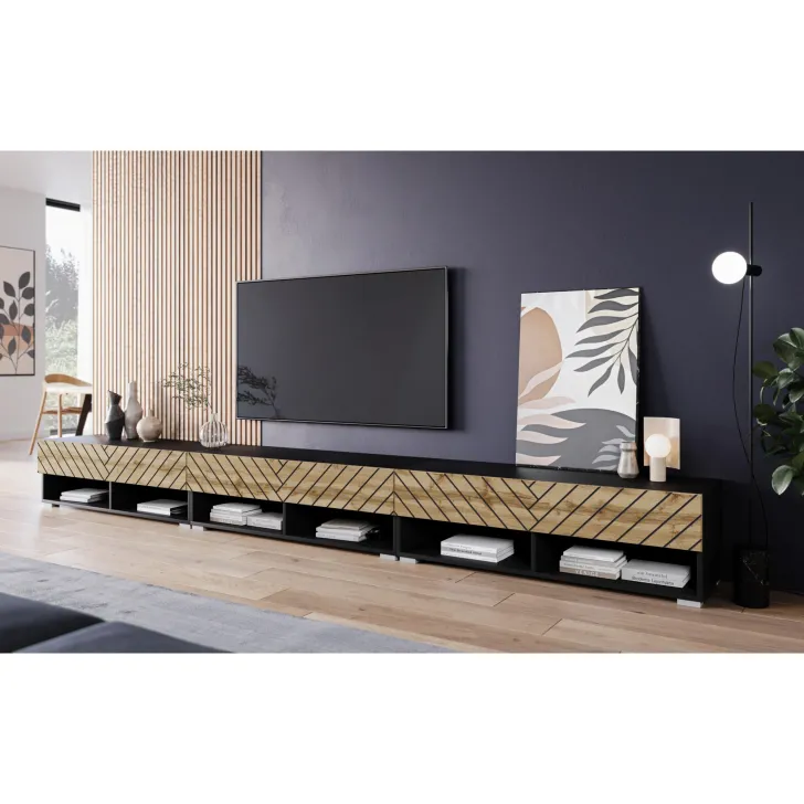 Szafka RTV "ANNE",300 cm, czarny grafit /front dąb wotan MDF Jodełka