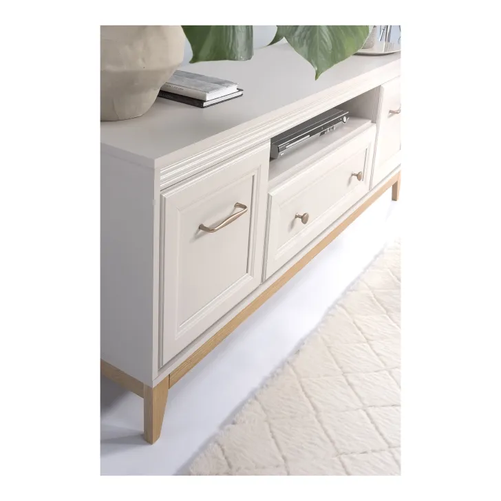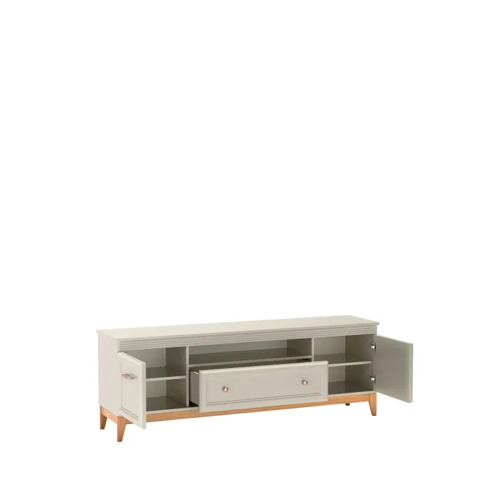 Oferujemy Państwu Szafkę RTV DUBAI 9, idealnie wpisującą się zarówno w klasyczne, jak i nowoczesne aranżacje. Jest to praktyczny mebel, który doskonale porządkuje przestrzeń pod telewizorem, dostarczając możliwości przechowywania. Dwa zamykane szafki z półkami oraz pojemna szuflada to miejsce, gdzie porządkowo schowamy różne akcesoria, a otwarta wnęka stanie się doskonałym miejscem na dekoder czy ulubione książki. Jeżeli cenisz sobie harmonię i wyważoną elegancję w swoim domu, szafka RTV z kolekcji DUBAI jest dla Ciebie idealna!