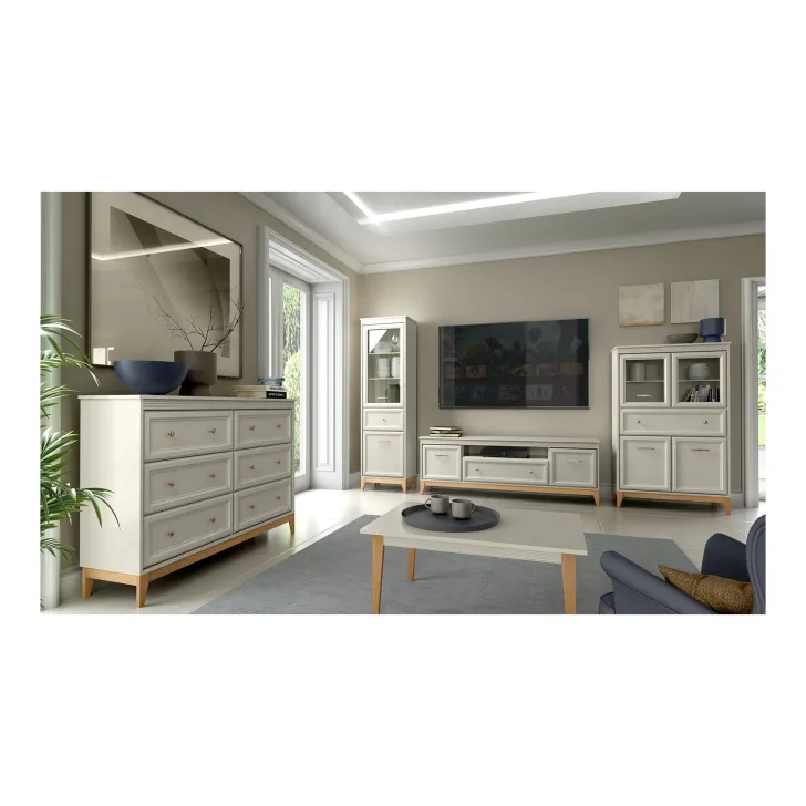 Szafkę cechuje estetyka i jakość wykonania. Zestawienie ciepłego naturalnego drewna z odcieniem kaszmir nadaje meblowi lekkości, a dekoracyjne listwy MDF na frontach dodają klasycznego uroku i subtelnie zdobią bryłę. Stylowe uchwyty w kolorze miedzi są detalem podkreślającym charakter mebla. Nogi z litego drewna dębowego nie tylko gwarantują trwałość, ale również dodają naturalnego piękna.