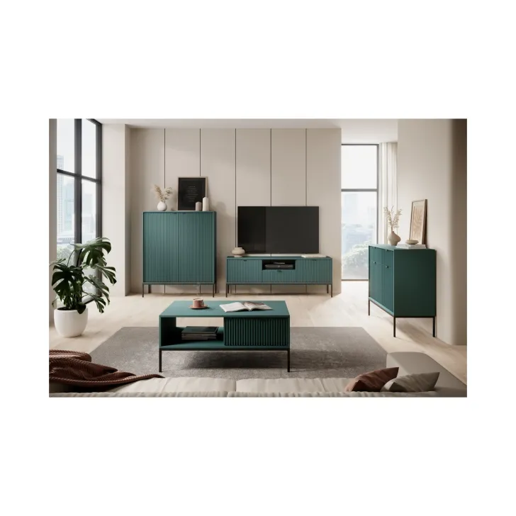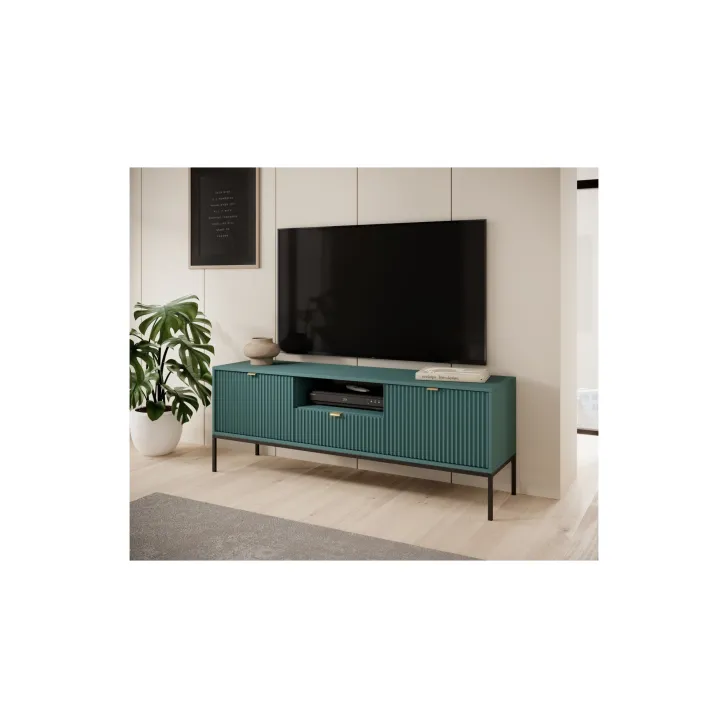Kolejną znaczącą cechą tej szafki RTV są fronty wykonane z MDF, które w połączeniu z wybranym kolorem szafki tworzą niepowtarzalny design. Kolor szafki to nie jedyna możliwość personalizacji — dostępne są różne kolory klamek i nóg, dzięki czemu możesz dostosować wygląd szafki do swojego wnętrza.