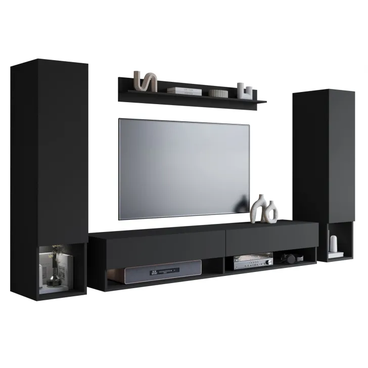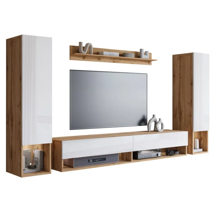 - Wysoka jakość wykonania - Korpusy i fronty meblościanki wykonane są z wytrzymałej płyty laminowanej o grubości 15mm, a ich krawędzie oklejone są estetycznym i odpornym obrzeżem ABS.