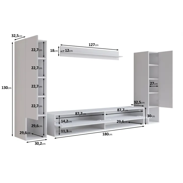 - Wisząca półka nad telewizor: Wysokość 18 cm x Szerokość 127 cm x Głębokość 12 cm