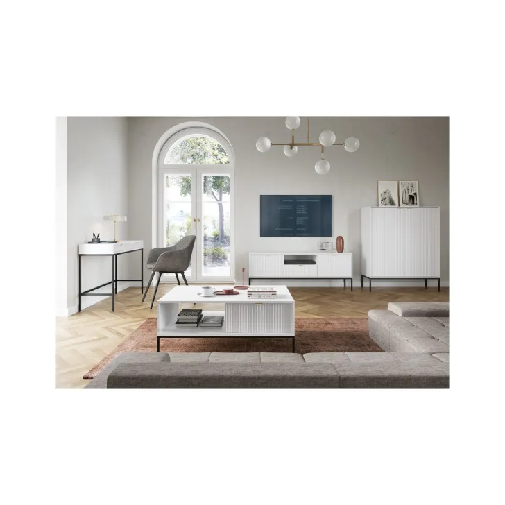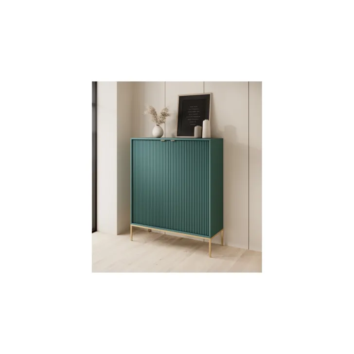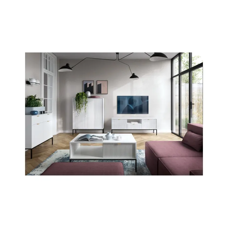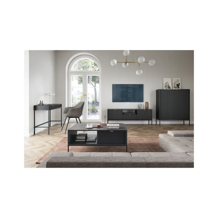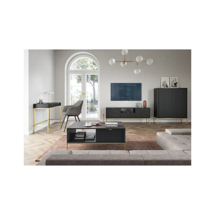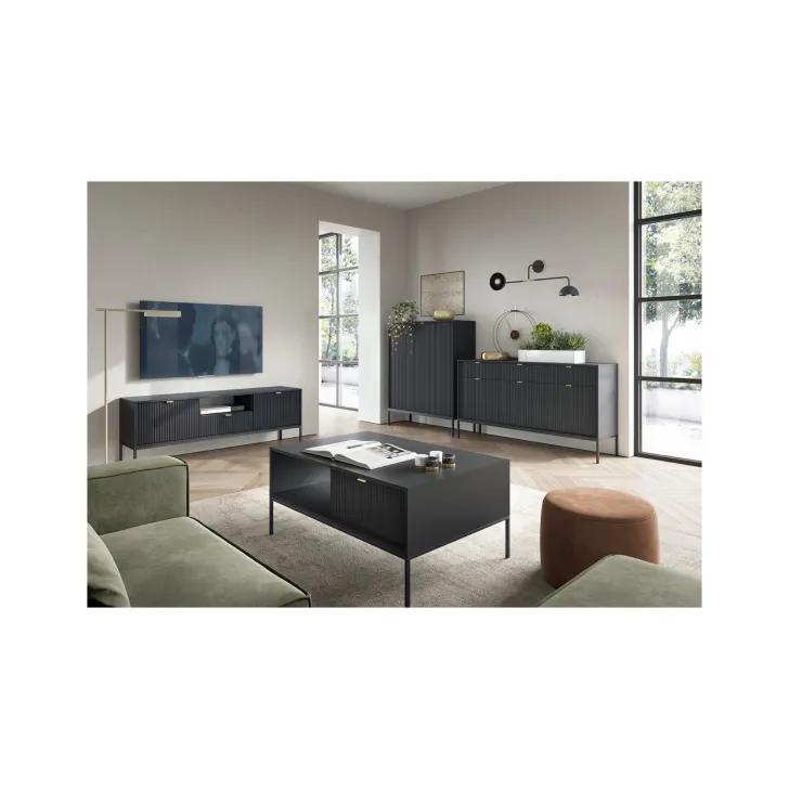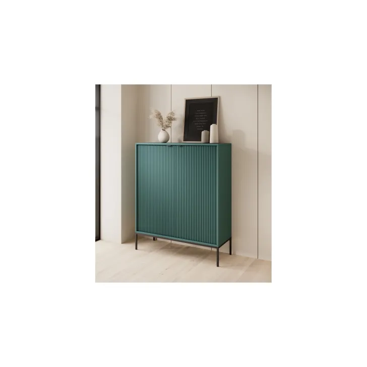 Komoda ta wyróżnia się eleganckimi metalowymi nogami, które dodają jej stabilności i nienagannego wyglądu. Fronty wykonane są z wysokiej jakości MDF, oferując ładny, estetyczny wygląd.