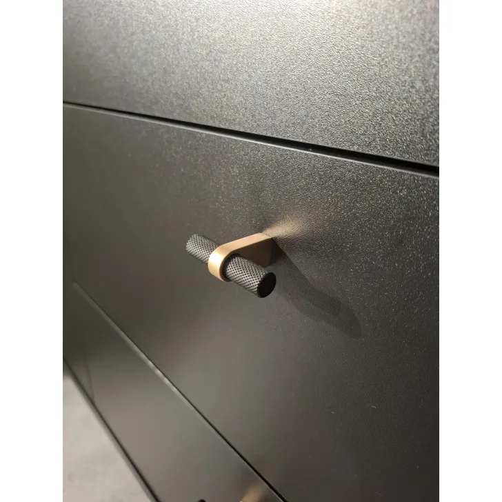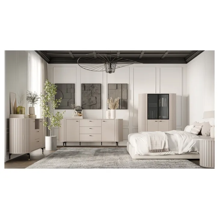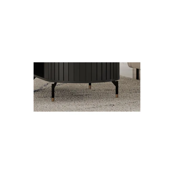 Zwraca uwagę wysokiej jakości wykonanie - zaokrąglone boki z MDF oraz korpus i tył z płyty laminowanej o grubości 16 mm to gwarancja trwałości i niezwykłej estetyki. Projekty serii ZAMA 1 charakteryzują się nowoczesnym designem oraz subtelnymi nóżkami i uchwytami w tonacji czarno-złotej, które dodają meblom nie tylko lekkości, ale również ekskluzywnego wyglądu.