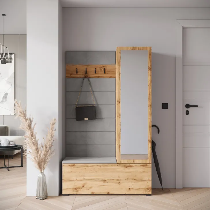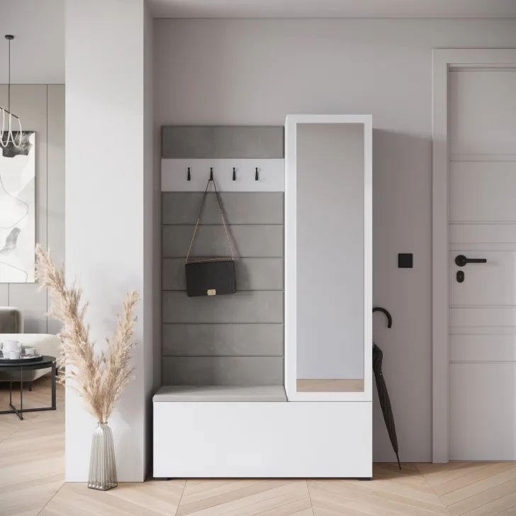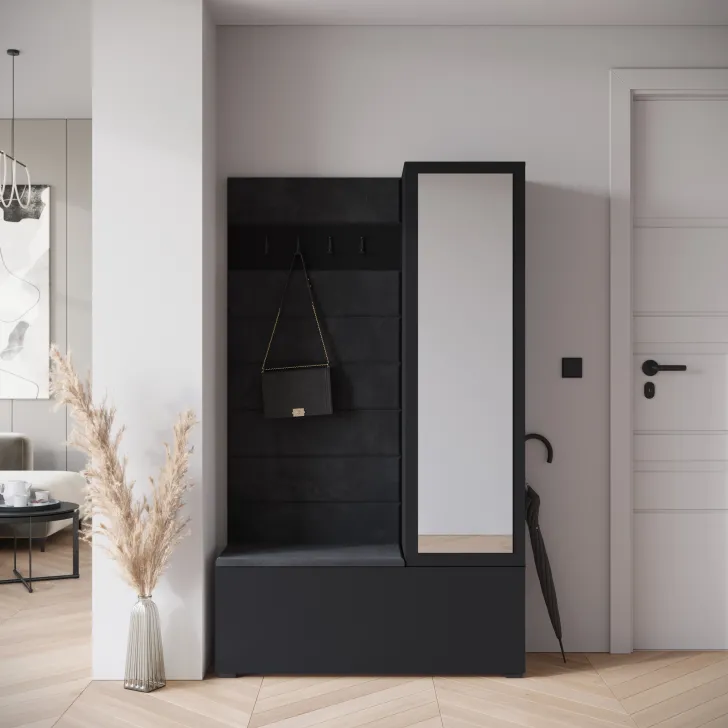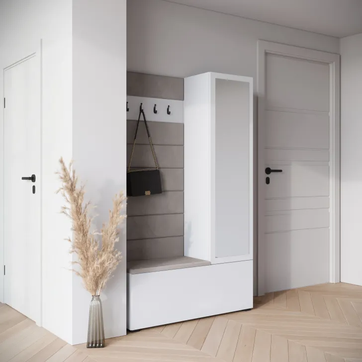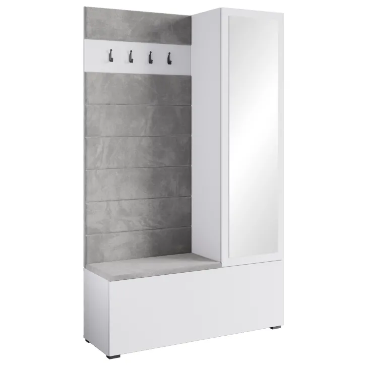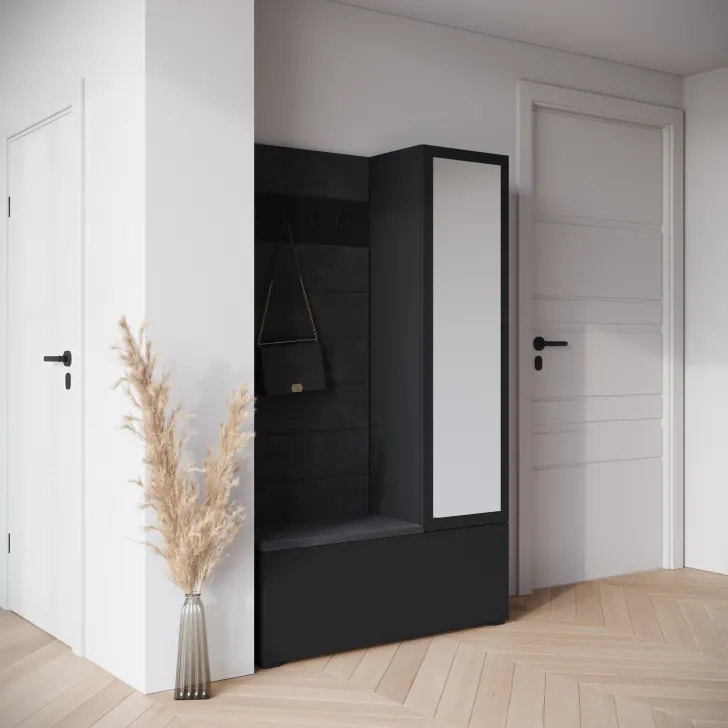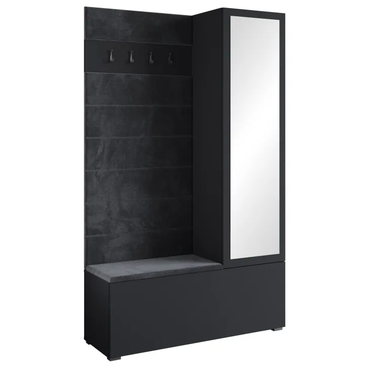 - Wygodne i efektowne wyposażenie : Panele tapicerowane, oraz siedzisko wykonane są w tkaninie MONO, dodając garderobie oryginalnego wyglądu. Panele ścienne przyklejane są do ściany, a siedzisko jest montowane na wkręty.