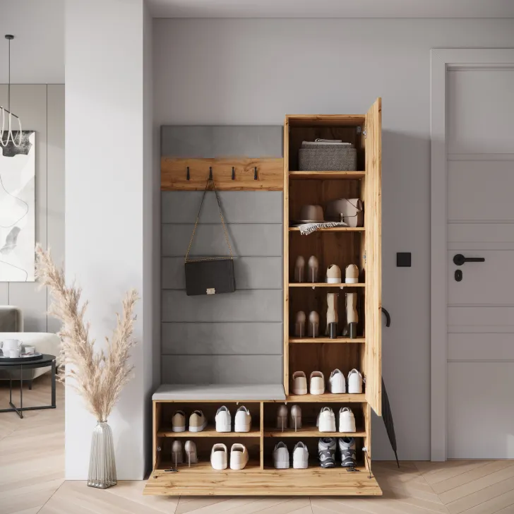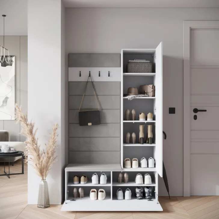 - Wygodne korzystanie: dolna szafka na buty z klapą na rozwórce samohamownej sprawia, że korzystanie z garderoby jest niezwykle proste i bezproblemowe.