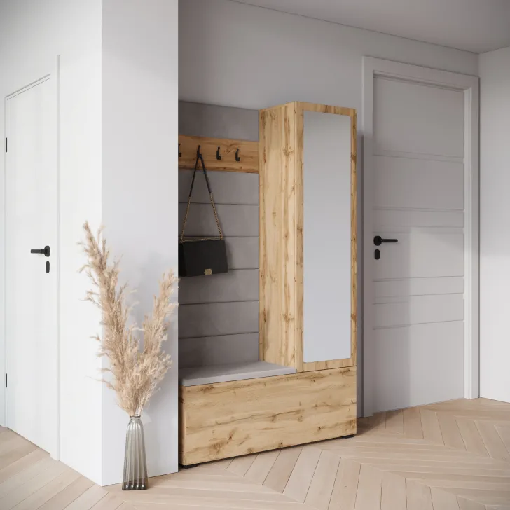 - Estetyka: Lustro na przednim froncie szafy oraz elegancki design sprawiają, że garderoba stanowi nie tylko praktyczny, ale również dekoracyjny element przedpokoju.