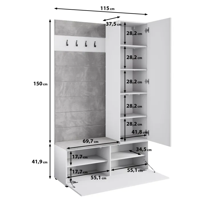 Garderoba TOKAT II, to doskonałe rozwiązanie dla tych, którzy pragną stworzyć funkcjonalną i przytulną przestrzeń w swoim przedpokoju. Przemyślany design oraz solidna konstrukcja czynią z niej prawdziwy klejnot wśród elementów wyposażenia każdego przedpokoju. Dzięki swojej pojemności, garderoba pozwoli na posegregowanie i uporządkowanie ubrań i obuwia w wygodny sposób.