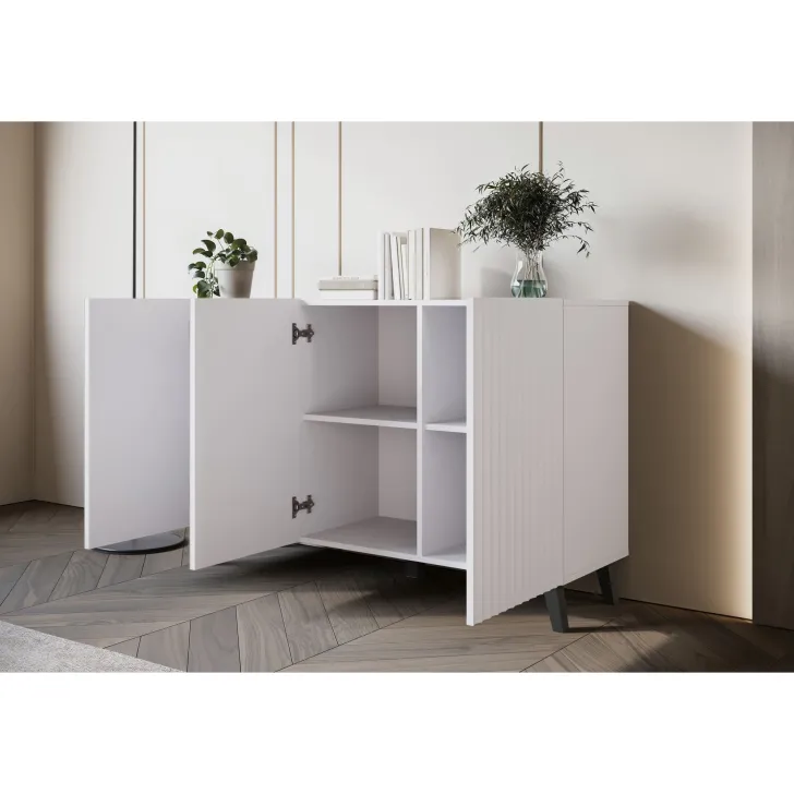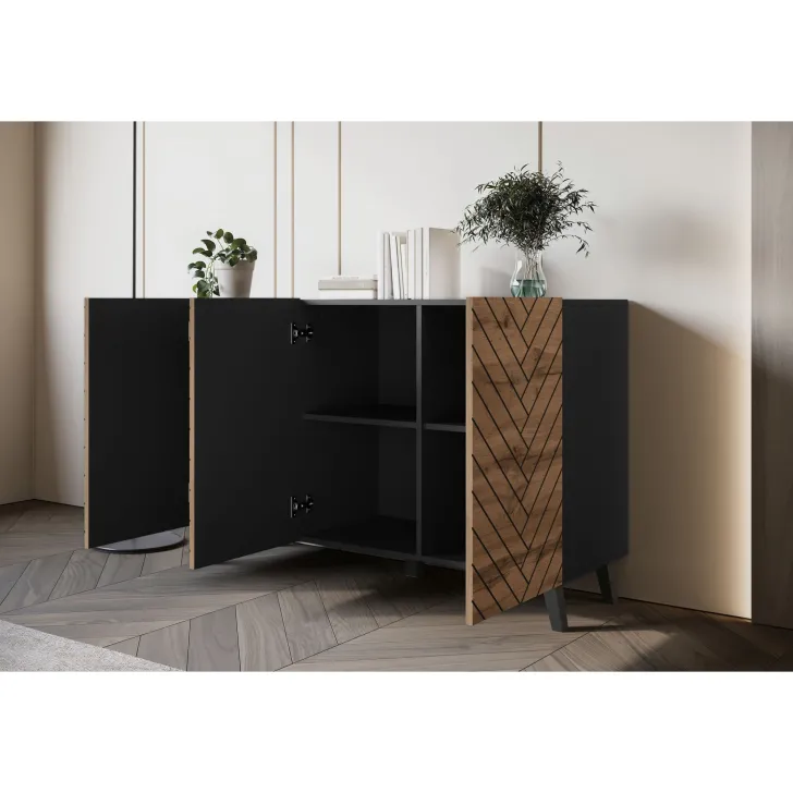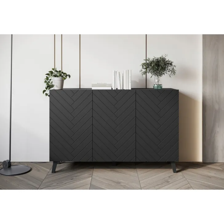 Komody w wybarwieniu : czarny z wzorem jodełka; czarny/dąb wota z wzorem jodełka; biały z wzorem ryflowanie pionowe, proste; dąb artisan/biały z wzorem ryflowanie pionowe, slim posiadają nóżki w kolorze czarnym, fronty otwierane za pomocą chwytu za krawędź wystającą poza obrys bryły.