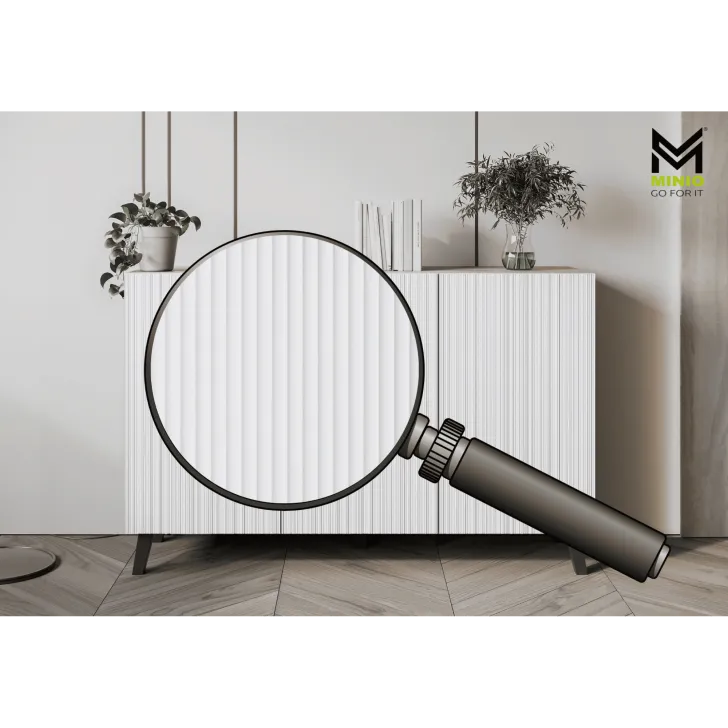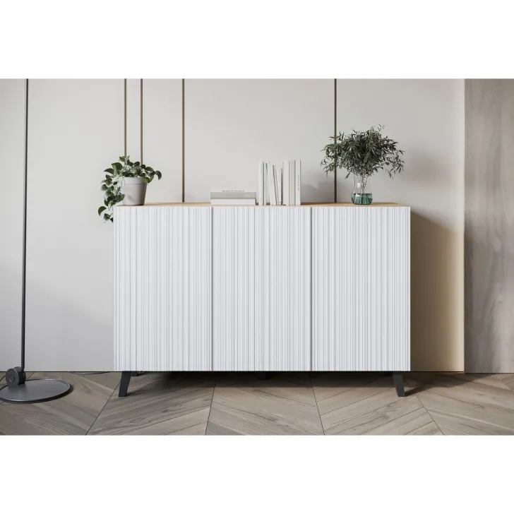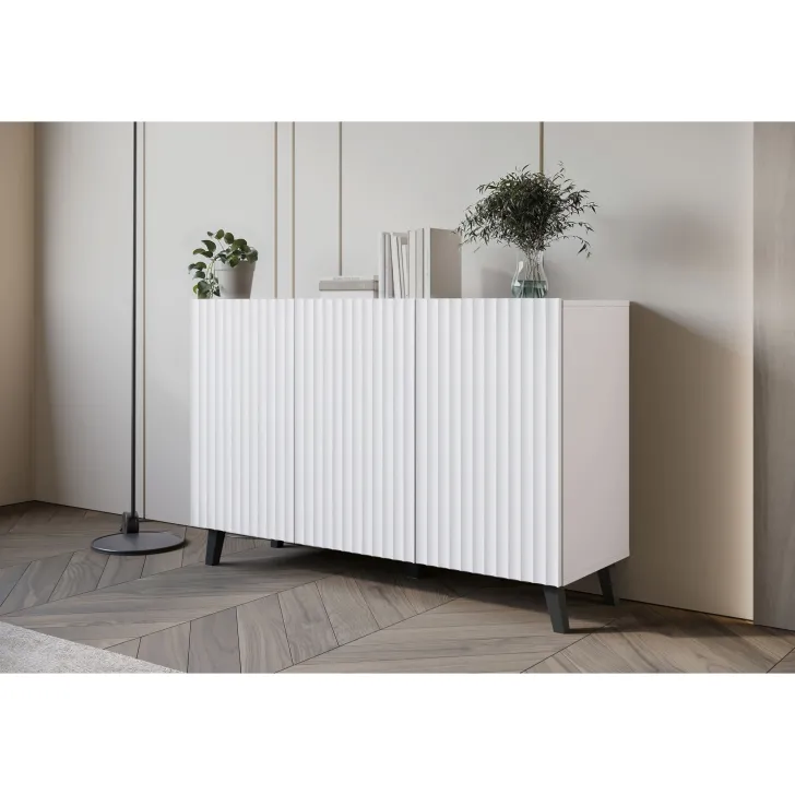 Zadbaj o eleganckie i nowoczesne wykończenie swojego domu dzięki pięknie zaprojektowanej Komodzie "LOKET" o szerokości 120 cm, z frezowanym frontem MDF. Wykonana z materiałów najwyższej jakości, ta komoda nie tylko dodaje stylu do każdego pomieszczenia, ale również dodaje praktycznej przestrzeni do przechowywania. Komoda "LOKET" składa się z wysokiej jakości płyty laminowanej dostępnej w kilku kolorach i wzorach do wyboru, zapewnienia trwałości i wytrzymałości. Dzięki potrójnemu zestawowi drzwi, za którymi znajdują się pojemne wnęki przedzielone półkami, możesz łatwo i wygodnie organizować swoje przedmioty, od biżuterii do bielizny i odzieży. Oprócz funkcjonalności, komoda ta oferuje unikalny styl, który na pewno przyciągnie wzrok. Fronty mebla są frezowane dla dodatkowego efektu, a zastosowany na nich wzór 3D sprawia, że mebel jest wyjątkowy i innowacyjny. Dopełnieniem komody jest szeroki blat, który poza miejsce do przechowywania, jest również idealne do wyeksponowania ozdób czy innych dekoracji, dodając jeszcze więcej uroku Twojemu wnętrzu.