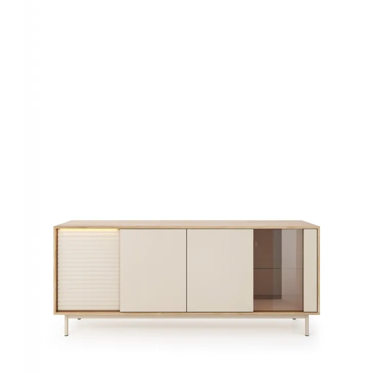 Nasza unikalna komoda z serii LITA to połączenie nowoczesnej prostej formy z delikatnym eleganckim klimatem. Zestawienie kolorów dąb olejowany i kaszmir, ryflowane fronty oraz wygięte metalowe nóżki tworzą wyjątkowy mebel z dużą ilością przestrzeni przechowywania. Doskonałym dodatkiem jest subtelne oświetlenie LED, które podkreśla frezowany wzór 3D na froncie wykonanym z płyty MDF i dodaje charakteru całej konstrukcji.