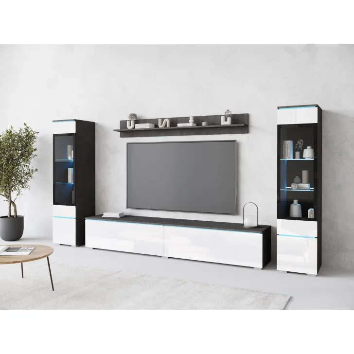 Dodatkowo, Meblościanka "VEVE 2" dostępna jest w wielu różnych wykończeniach, takich jak: Dąb wotan/czarny połysk, San Sebastian, Czarny, Dąb Artisan, Grafit Matera/biały połysk, Dąb wotan/biały połysk, Biały, Dąb wotan, Beton/biały połysk, Misty green, Szary pallad, grafit Matera/kasztan wrocławski, Kaszmir, Biały matowy/szary połysk - na pewno znajdziesz kolor, który idealnie dopasuje się do Twojego salonu.