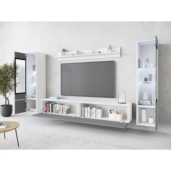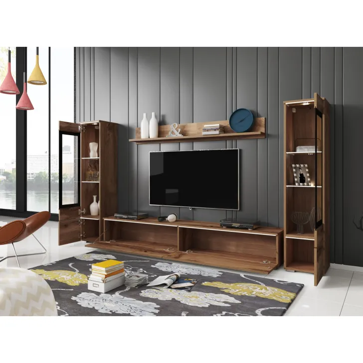 Alegoria elegancji w postaci szafki RTV, półki i dwóch witryn, zapewni, że twoje wnętrza będą wyglądały modnie i funkcjonalnie. Meblościanka "VEVE 2" będzie doskonałym wyborem, zarówno do nowoczesnych, jak i tradycyjnych wnętrz. Każdy element tej meblościanki może być wiszący lub stojący, co daje nieograniczone możliwości organizacji przestrzeni.