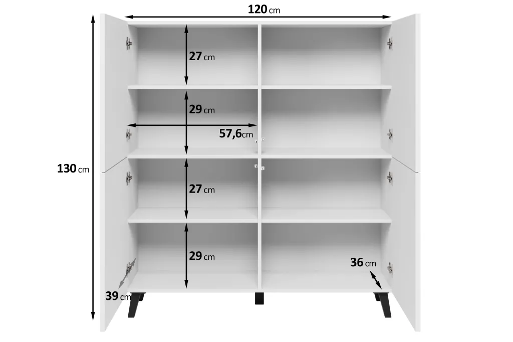Mebel posiada masywną konstrukcję opartą na wysokich nóżkach. Komoda posiada czworo drzwi, za którymi znajdują się specjalne wewnętrzne podziały, składające się z półek, tworzących pojemne wnęki idealne do przechowywania różnego rodzaju przedmiotów.